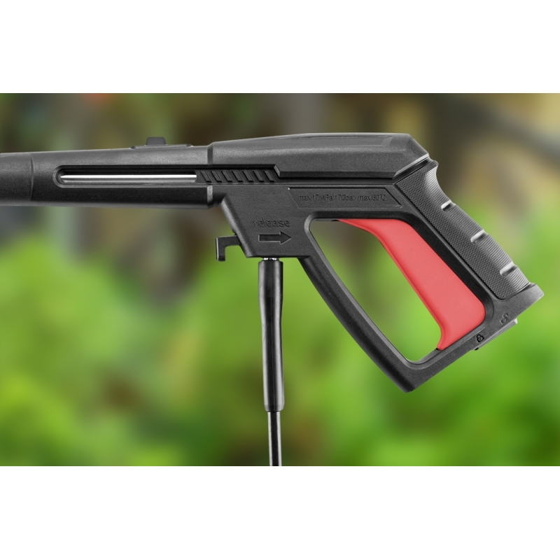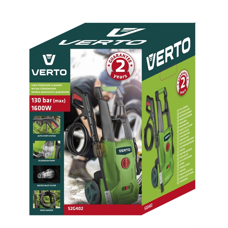 Myjka ciśnieniowa 1600 W, aluminiowa pompa, ciśnienie robocze 90 bar, maks. ciśn. 130 bar, przepływ 6.0 l/min, max. temperatura wody zasilającej 500C, masa 7.4 kg, akcesoria: rękojeść pistoletowa, lanca z dyszą, wbudowany zbiornik na detergent, wąż wysokociśnieniowy 5 m, uchwyt na wyposażenie, złacze wlotu wody z filtrem, przetyczka do czyszczenia dyszy
