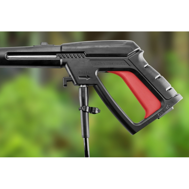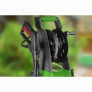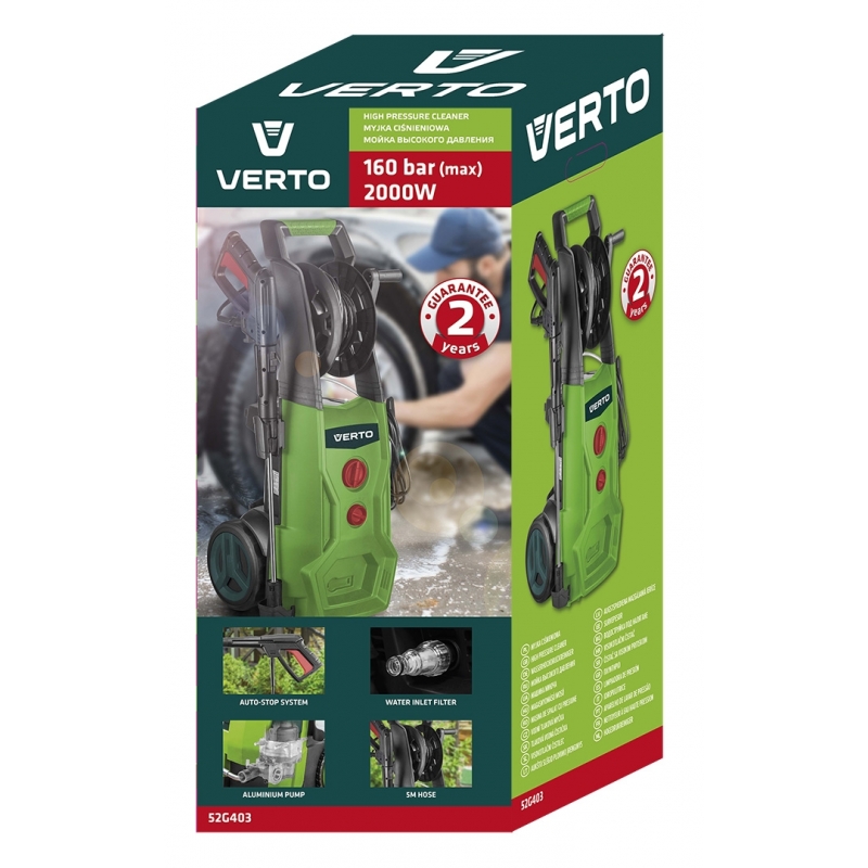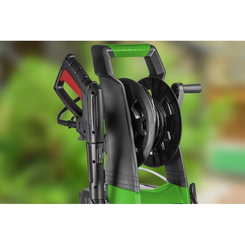 Myjka ciśnieniowa 2000 W, aluminiowa pompa, ciśnienie robocze 110 bar, maks. ciśn. 160 bar, przepływ 6.5 l/min, max. temperatura wody zasilającej 500C, masa 11.2 kg, akcesoria: rękojeść pistoletowa, lanca z dyszą, wbudowany zbiornik na detergent, wąż wysokociśnieniowy 5 m na bębnie, uchwyt na wyposażenie, złacze wlotu wody z filtrem, przetyczka do czyszczenia dyszy