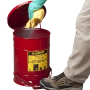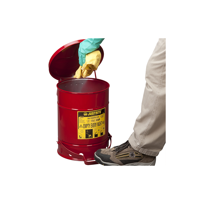 Pojemnik umożliwia bezpieczne magazynowanie w miejscu pracy pozostałości nasączonych olejem, rozpuszczalnikami i zabezpiecza przed pożarem. Czyściwa nasączone płynami łatwopalnymi stanowią poważne zagrożenie, jeśli nie są właściwie przechowywane. Specjalnej konstrukcji pokrywa otwiera się pod kątem ponad 60 stopni i po zdjęciu stopy z pedału nożnego zamyka się samoczynnie, izolując odpady od źródeł ognia i zapłonu. Konstrukcja pojemnika otwieranego na pedał zapewnia, że pojemnik zawsze będzie zamknięty. Taka konstrukcja ułatwia pracę gdyż nie ogranicza rąk. Brak dostępu tlenu uniemożliwia samozapłon zawartości pojemnika. Pojemnik wykonany został w wyraźnych kolorach w celu zaznaczenia miejsca przechowywania substancji niebezpiecznych.