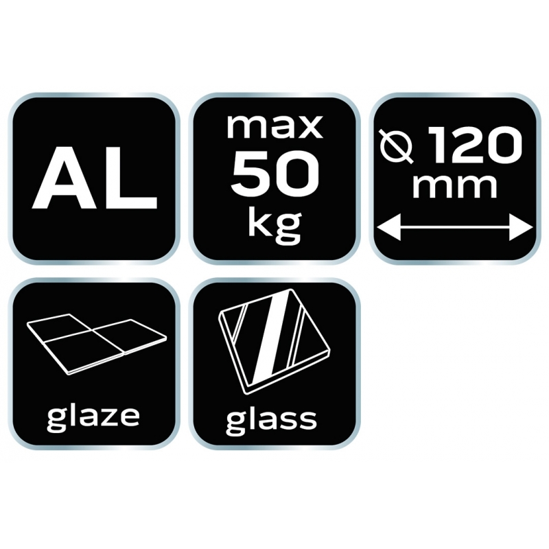 Przyssawka do szyb pojedyncza, 50 kg, monolityczyny aluminiowy korpus, wytrzymałe, aluminiowe zatrzaski. Przeznaczona do bezpiecznego przenoszenia i montażu różnych elementów np. szyb, glazury, gresu, blach, płyt laminowanych i wielu innych.