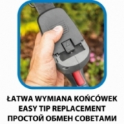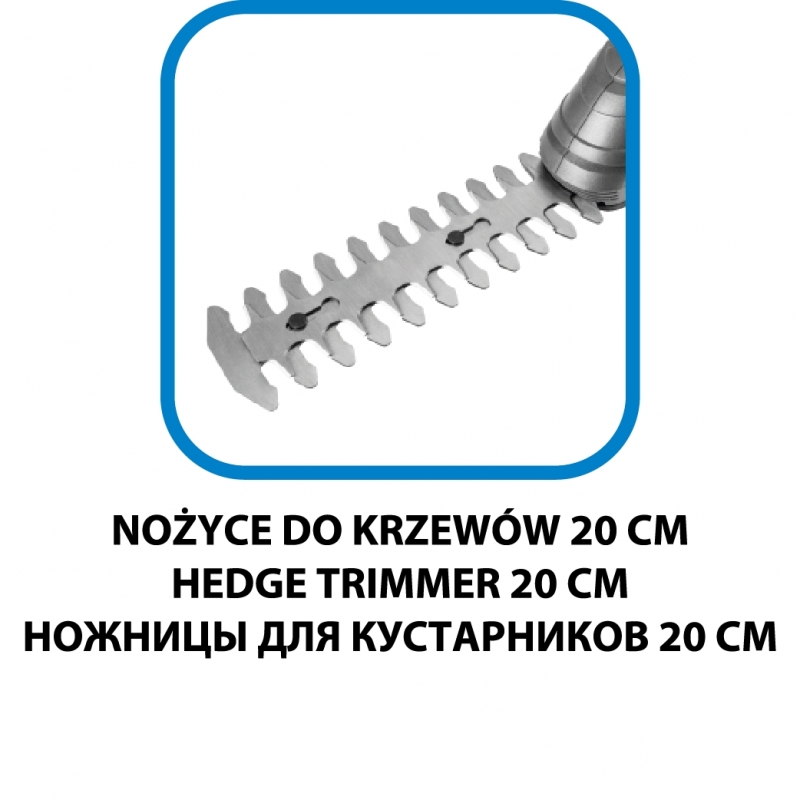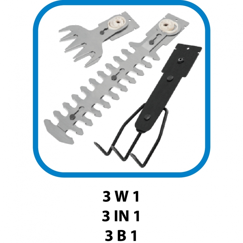 Trymer do trawy 3w1 18 V bez akumulatora do pielęgnacji krzewów, żywopłotów i korygowania krawędzi trawnika. Działa z akumulatorem litowo-jonowym o mocy 18 V (rekomendowana pojemność to 4 Ah). W zestawie z końcówkami – nożycami do trawy, żywopłotu oraz trójzębem. Uchwyt ma mocowanie 3/8”. Szerokość cięcia dla trymera to 100 mm, dla nożyc (o długości ostrza 200 mm) to 70 mm i trójzęby – 75 mm. Czas działania na akumulatorze 2 Ah to 1 godzina 55 minut. Napięcie zasilania; 18V DC, prędkość obrotowa silnika 16500 min-1, max. prędkość oscylacyjna 1200 min-1, waga 1,83 kg.