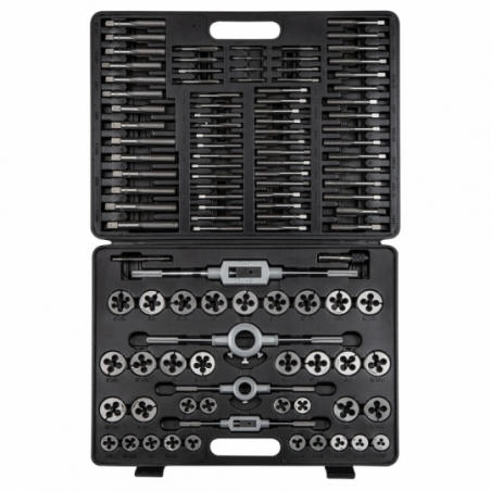 Narzynki i gwintowniki 110 elementów:35 par gwintowników: М2x0,4; М3x0,5; М4x0,7; М5x0,8; М6x0,75; М6x1,0; М7x0,75; М7x1,0; М8x0,75; М8x1,0; М8x1,25; М9x0,75; М9x1,0; М9x1,25; М10x0,75; М10x1,0; М10x1,25; М10x1,5; М11x0,75; М11x1,0; М11x1,25; М11x1,5; М12x0,75; М12x1,0; М12x1,25; М12x1,5; М12x1,75; М14x1,0; М14x1,25; М14x1,5; М14x2,0; М16x1,0; М16x1,5; М16x2,0; М18x1,5; 35 narzynki: М2x0,4; М3x0,5; М4x0,7; М5x0,8; М6x0,75; М6x1,0; М7x0,75; М7x1,0; М8x0,75; М8x1,0; М8x1,25; М9x0,75; М9x1,0; М9x1,25; М10x0,75; М10x1,0; М10x1,25; М10x1,5; М11x0,75; М11x1,0; М11x1,25; М11x1,5; М12x0,75; М12x1,0; М12x1,25; М12x1,5; М12x1,75; М14x1,0; М14x1,25; М14x1,5; М14x2,0; М16x1,0; М16x1,5; М16x2,0; М18x1,52 uchwyty do gwintowników: М3 - М12, М6 - М202 uchwyty do narzynek: 25 mm i 38 mmszybkozaciskowy uchwyt T do gwintowników М3 - М6.