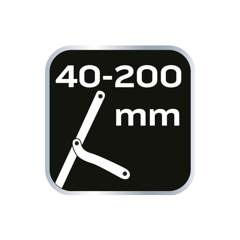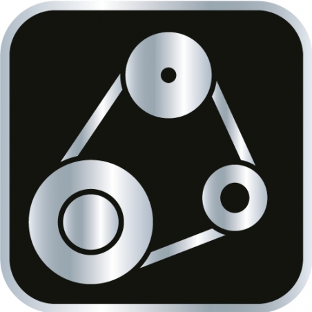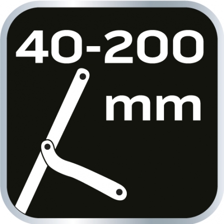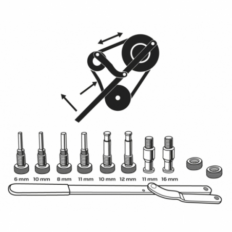 Klucz do napinania pasków klinowych: rękojeść przegubowa, 4 pary trzpieni (ø 6 x 10 mm, ø 8 x 11 mm, ø 10 x 12 mm, ø 11 x 16 mm), 2 nakrętki mocujące trzpienie, zakres 40 - 200 mm.