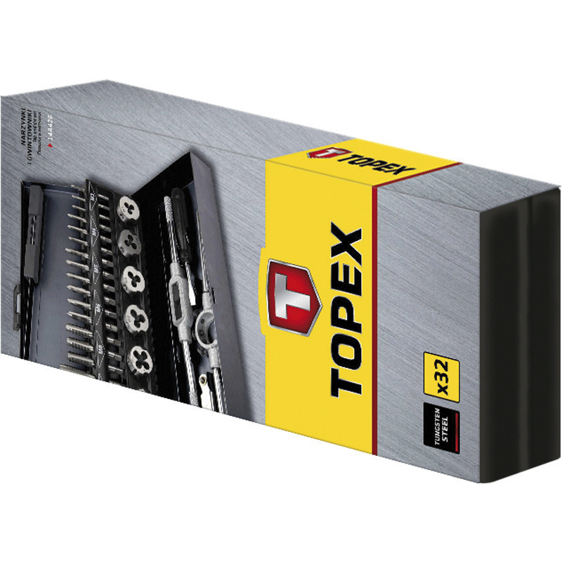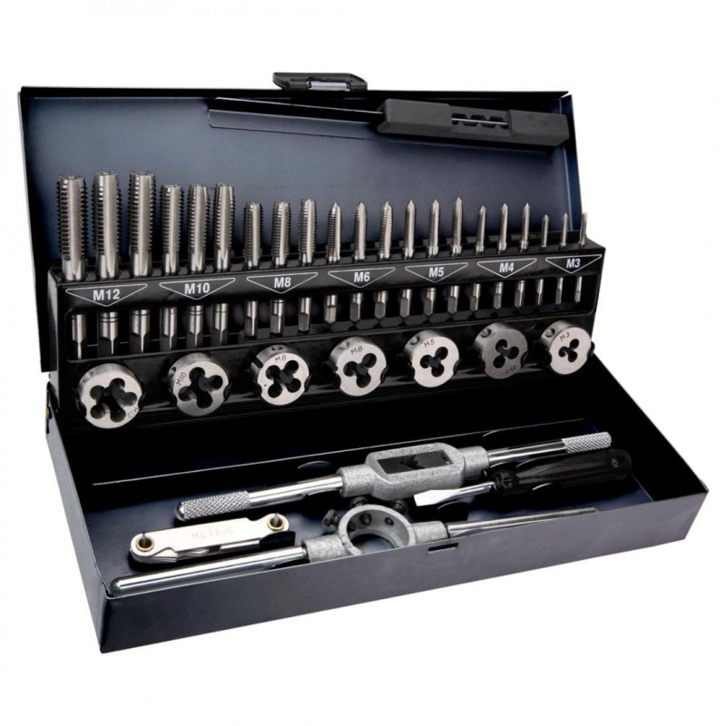 Narzynki i gwintowniki M3-M12, zestaw 32 szt., stal wolframowa, DIN352 / DIN233, metalowa kaseta do przechowywania, przymiar do gwintów, wkrętak do mocowania narzynek