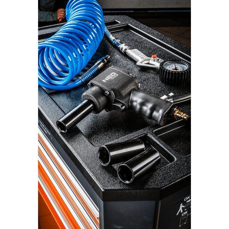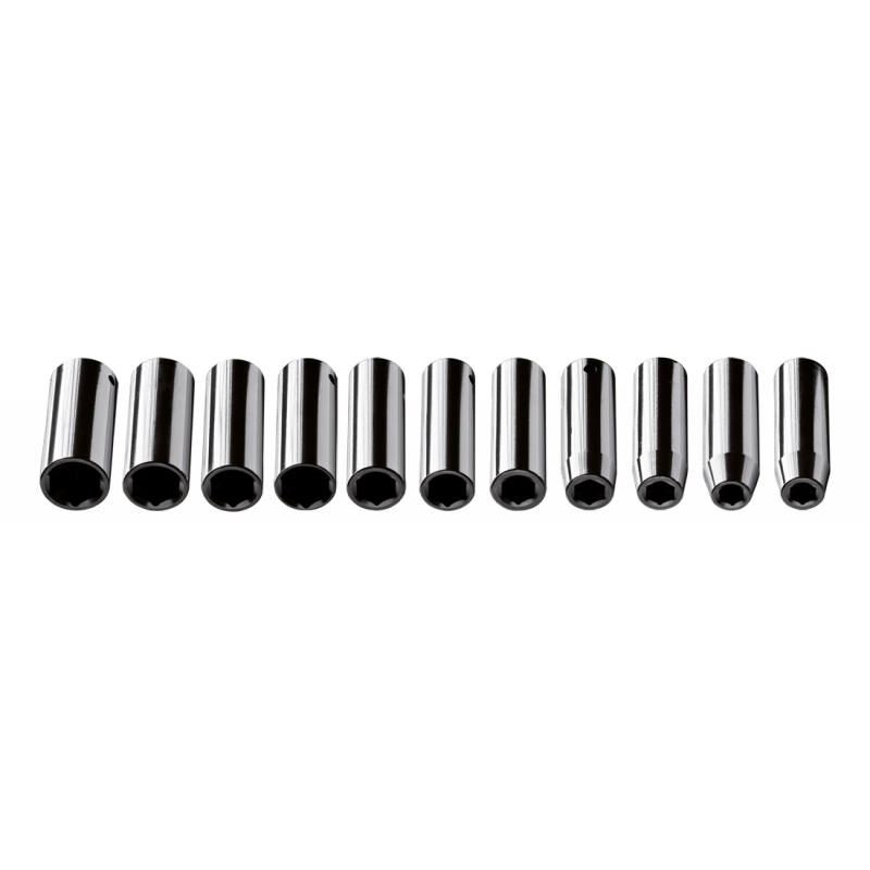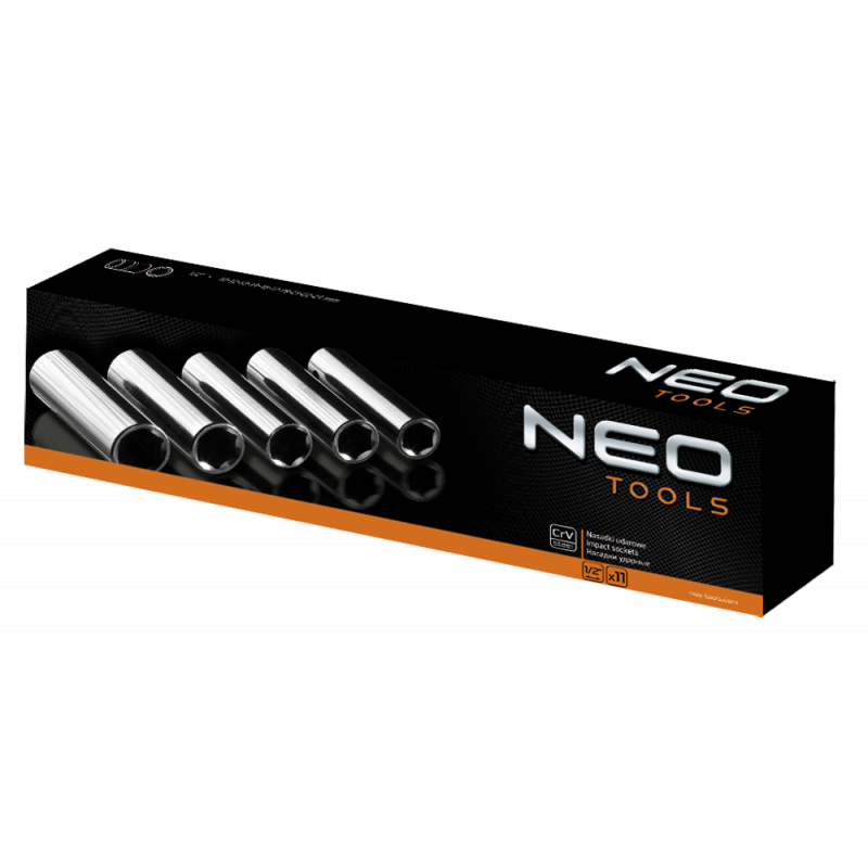 Nasadki udarowe sześciokątne, długie, 1/2", zestaw 11 szt., 10, 11, 12, 13, 14, 16, 17, 19, 21, 22, 24 mm, stal CrV, metalowa kaseta do przechowywania