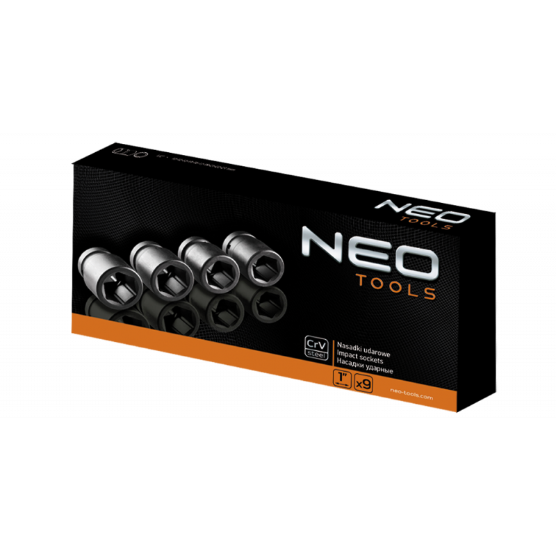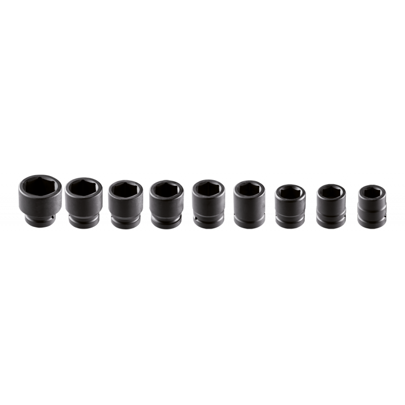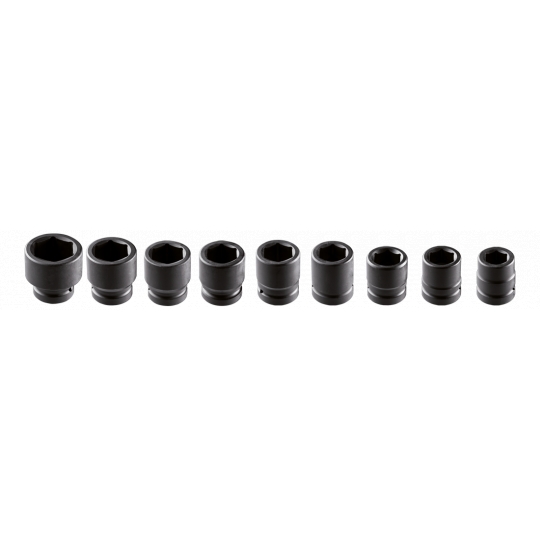 Nasadki udarowe sześciokątne, krótkie, 1", zestaw 9 szt., 27, 30, 32, 35, 36, 38, 41, 42, 50 mm, stal CrMo, metalowa kaseta do przechowywania