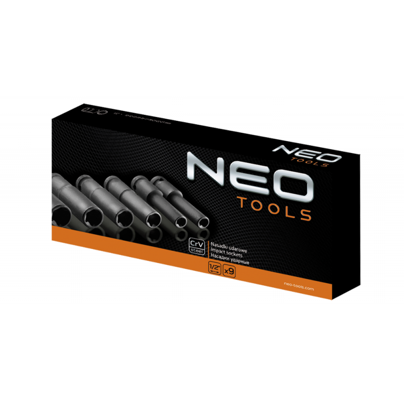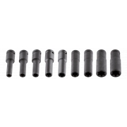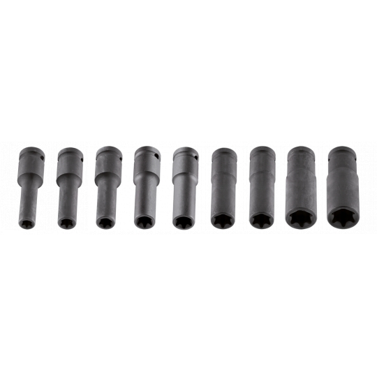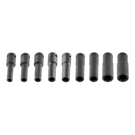 Nasadki udarowe Torx, długie, 1/2", zestaw 9 szt., E10, E11, E12, E14, E16, E18, E20, E22, E24 mm, stal CrMo, plastikowa kaseta do przechowywania