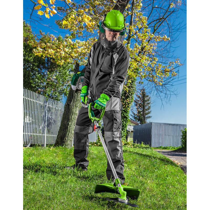 Ochraniacz słuchu, głowy i wzroku 3 w 1, kask wykonany z wysokiej jakości tworzywa ABS, zakres regulacji rozmiaru 55-62 cm; zgodny z normą EN397; nauszniki z miękkim wykończeniem wewnetrznym, SNR 25,7dB; wykonane zgodnie z normą EN 352; osłona twarzy wykonana z metalowej siatki chroniącej przed drobnymi cząsteczkami stałymi, zgodna z normą EN 1731; certyfikat CE