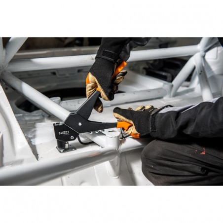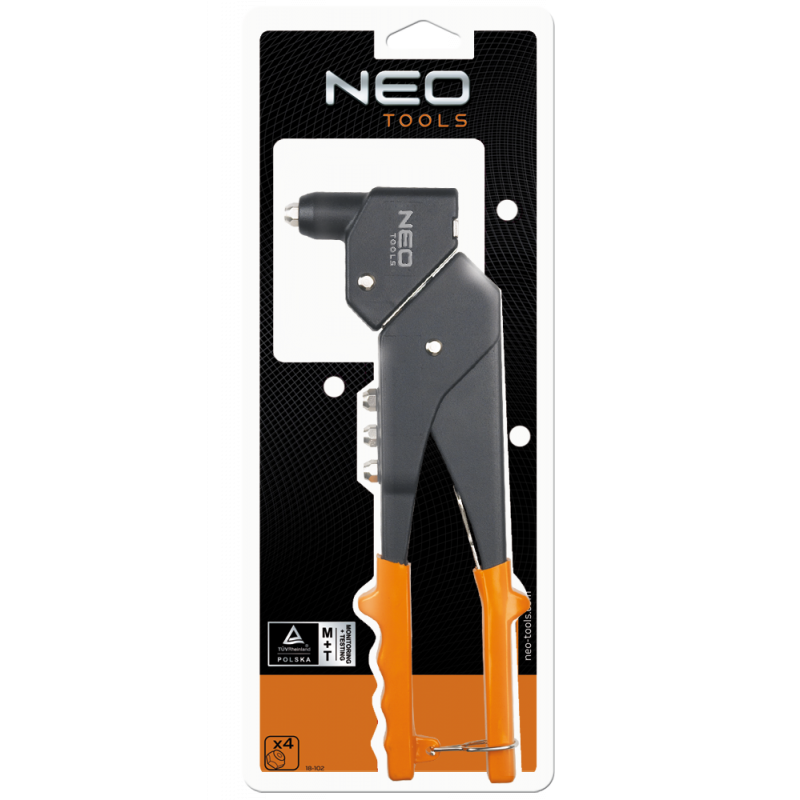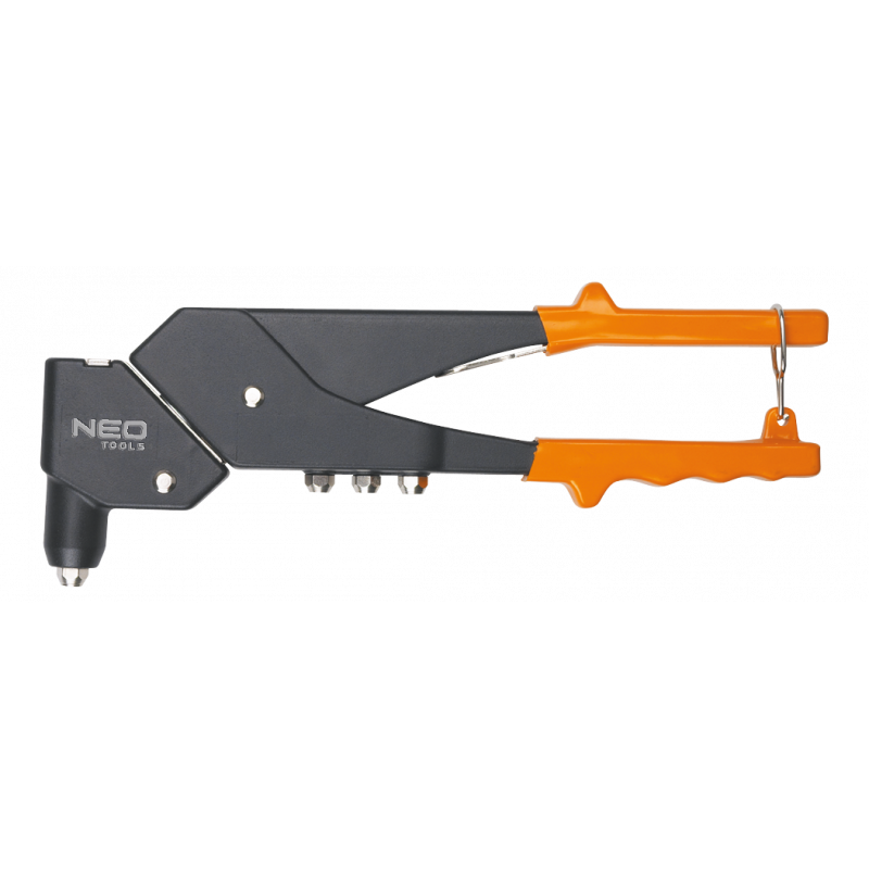 Nitownica do nitów stalowych i aluminiowych 2.4, 3.2, 4.0, 4.8 mm, wielopołożeniowa, 4 końcówki, obrotowa głowica, aluminiowy korpus, pierścień blokujący, klucz płaski, O2.4 mm: aluminium, stal, miedź, stal nierdzewna, O3.2 mm: aluminium, stal, miedź, O4.0 mm: aluminium, O4.8 mm: aluminium