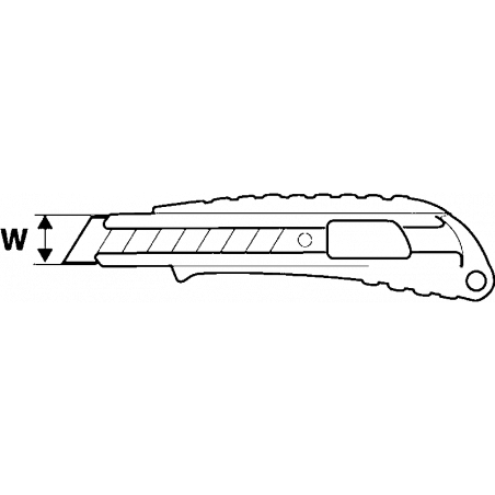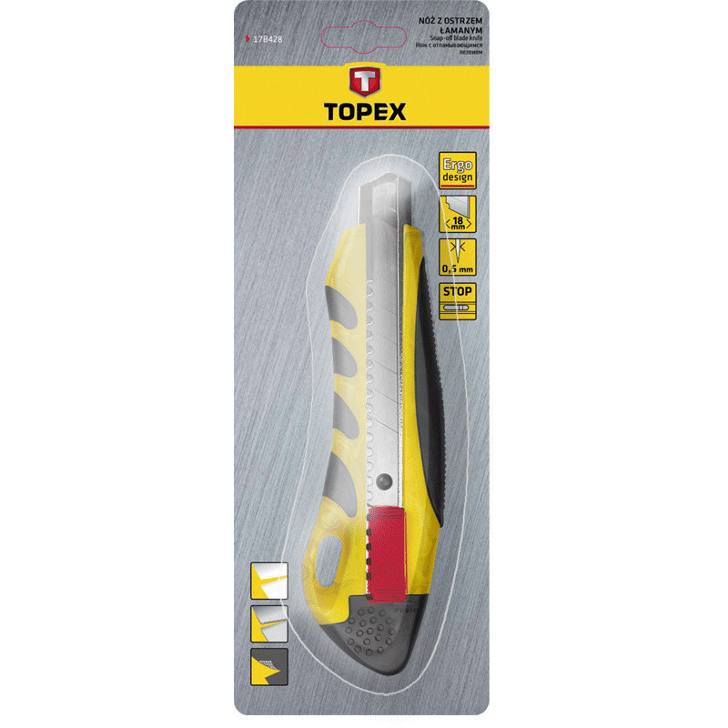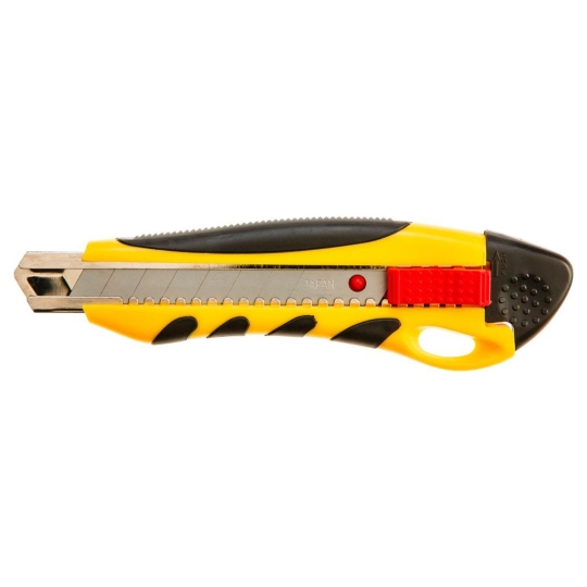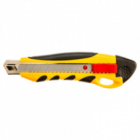 Nóż z ostrzem łamanym 18 mm, metalowe prowadnice, łamacz zużytego ostrza, korpus z tworzywa z okładziną antypoślizgową