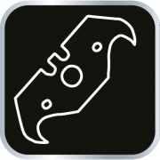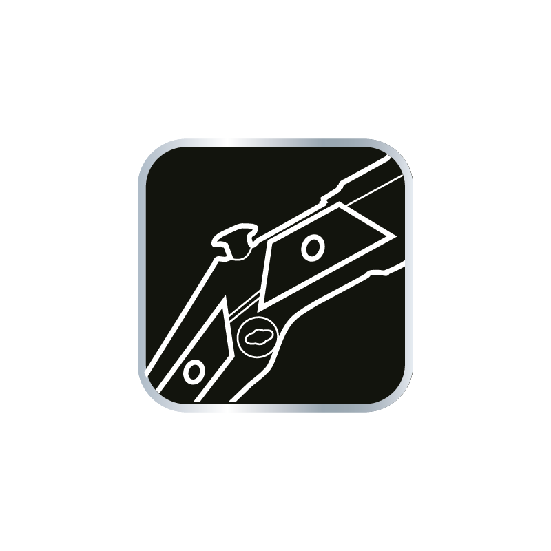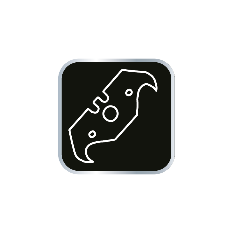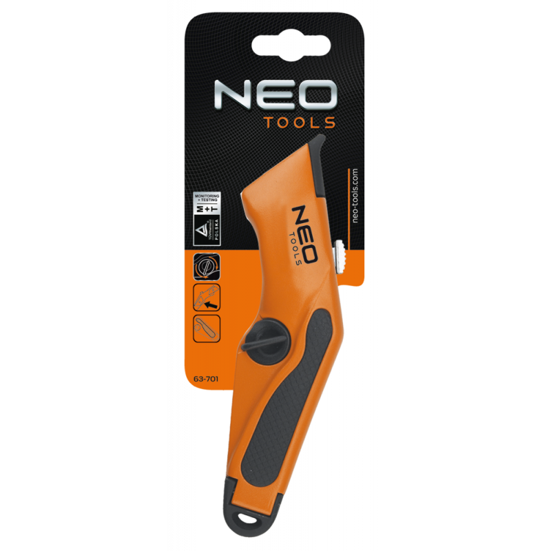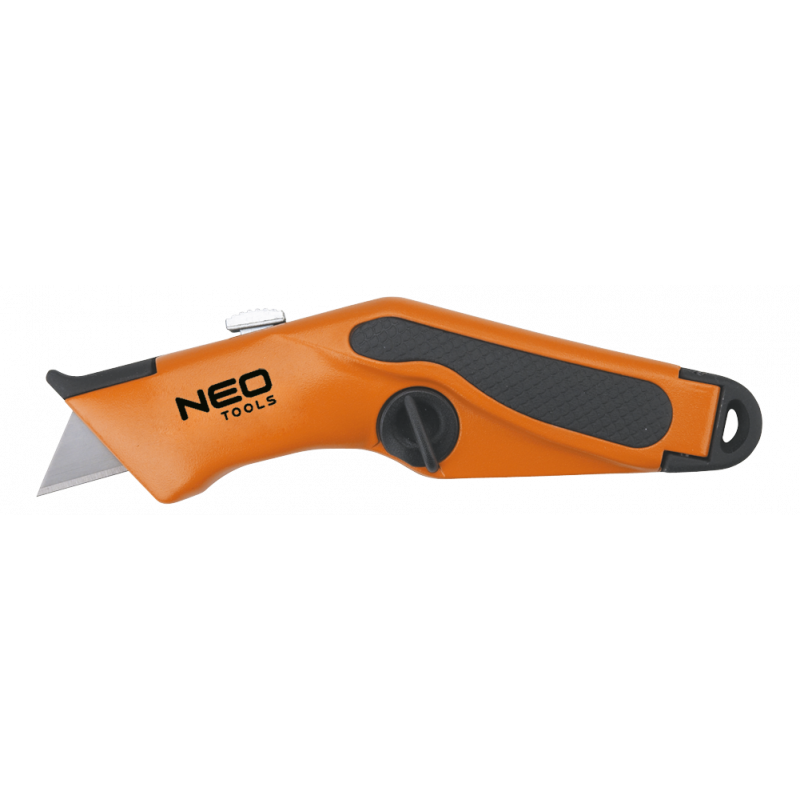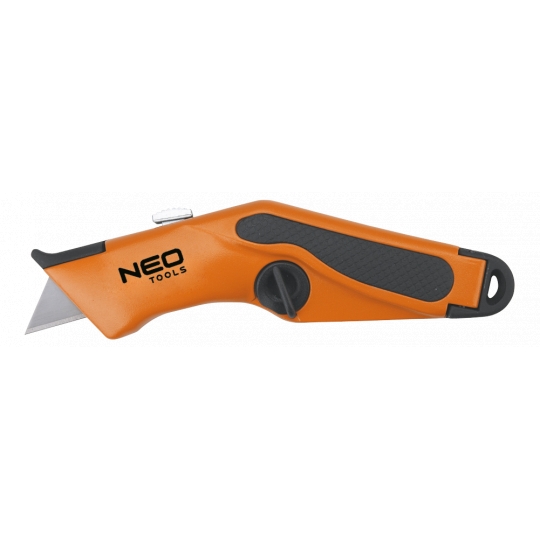 Nóż z ostrzem trapezowym 18 mm, metalowy korpus, metalowe prowadnice ostrza, dwumateriałowy uchwyt, mechanizm mocowania ostrza wzmocniony magnesami, TÜV