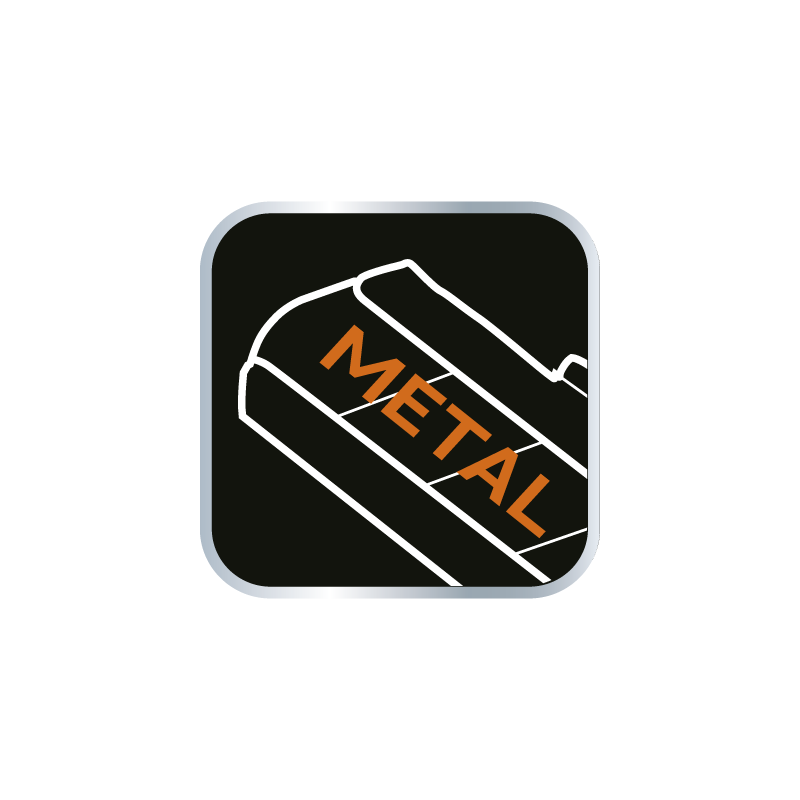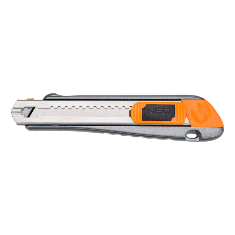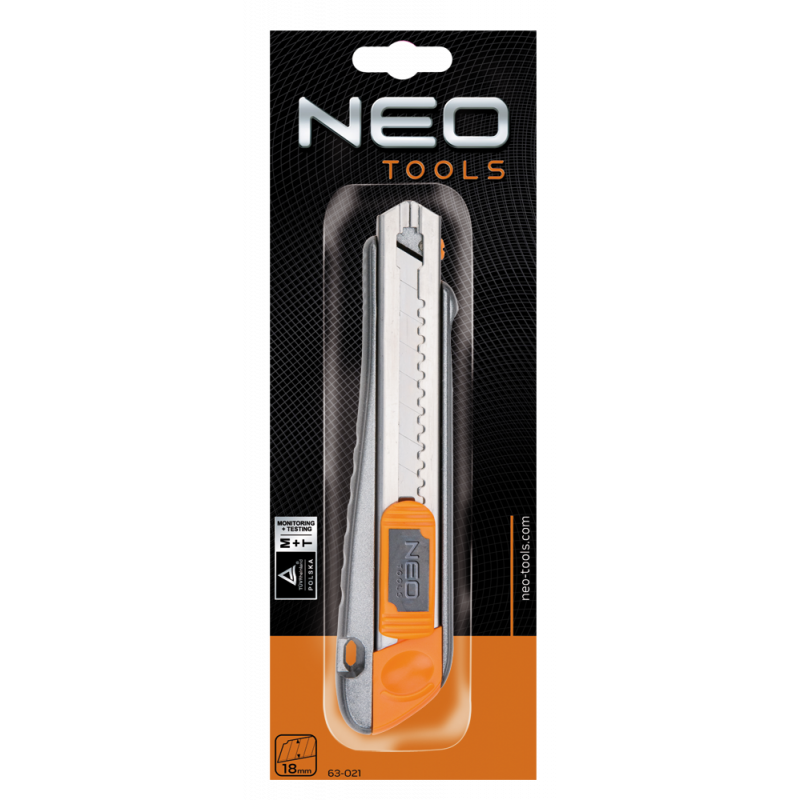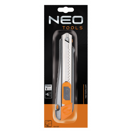 Nóż z ostrzem łamanym 18 mm, magazynek na 5 dodatkowych ostrzy w korpusie, metalowy korpus, metalowe prowadnice ostrza, dwumateriałowy uchwyt, łamacz zużytego ostrza, TÜV