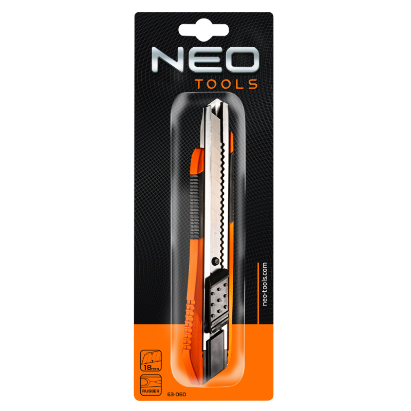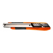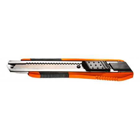 Nóż z ostrzem łamanym 18 mm, obudowa ze stopu cynku, metalowe prowadnice, dwumateriałowy uchwyt