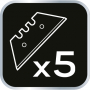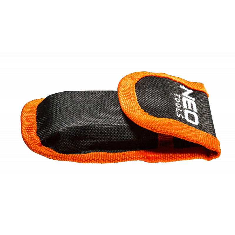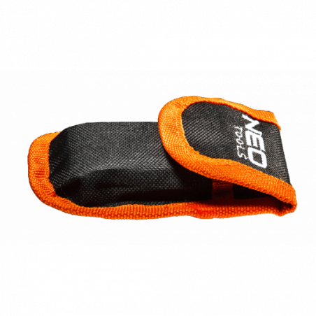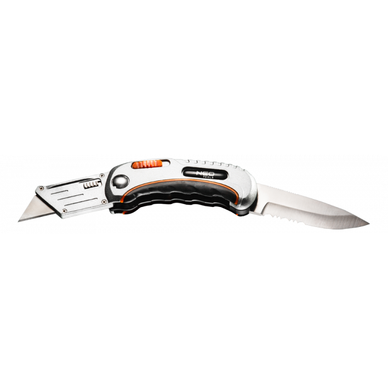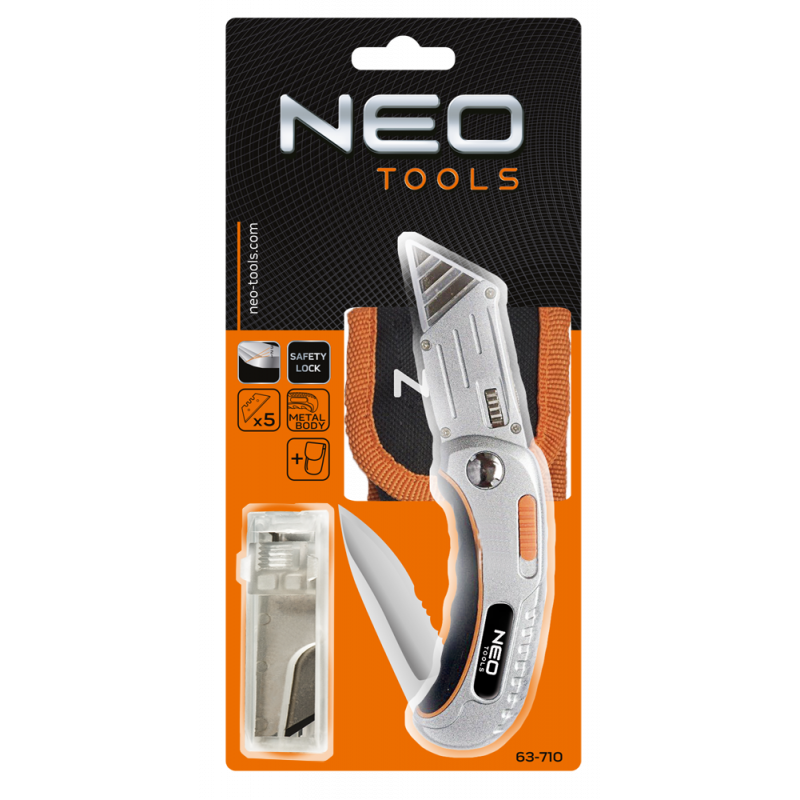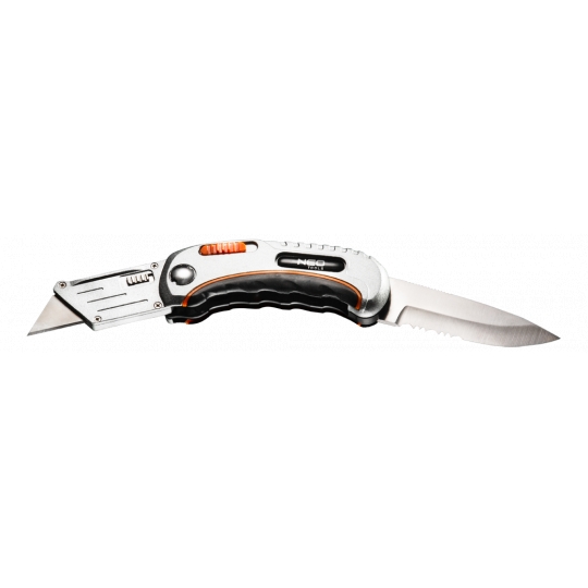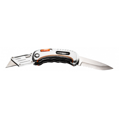 Nóż uniwersalny składany, dwie końcówki - nóż trapezowy i monterski, dwumateriałowy korpus, spust zabezpieczający, nylonowe etui, 5 trapezowych ostrzy w zestawie, blokada przed nieoczekiwanym zamknięciem.