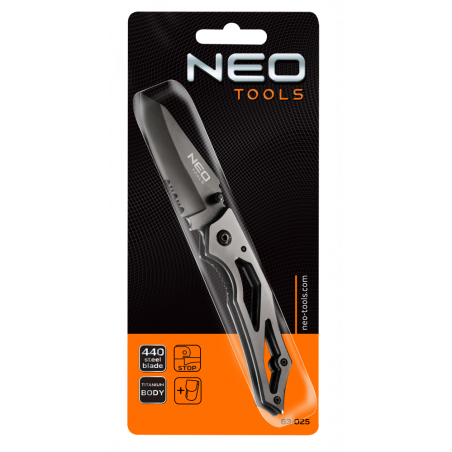 Nóż składany z blokadą, ostrze ze stali 440, długość ostrza 7 cm, tytanowa obudowa, klips zaczepowy, końcówka do wybicia szyby, blokada przed nieoczekiwanym zamknięciem, waga 60 g, długość po zamknięciu 105 mm, nylonowy pokrowiec
