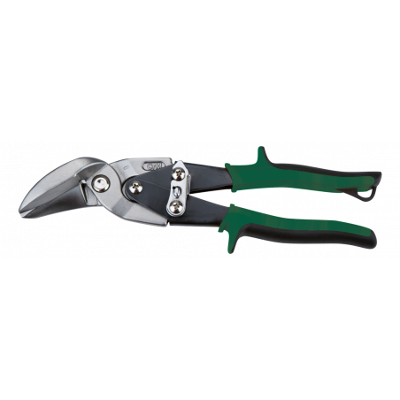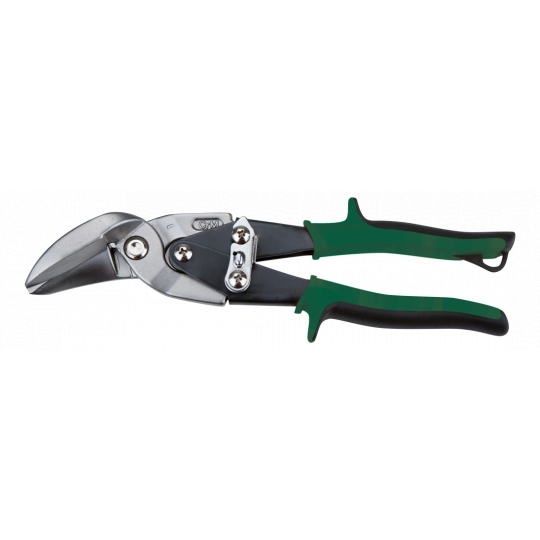 Nożyce do blachy 240 mm, odgięte lewe, stal CrMo, dwumateriałowe uchwyty, HRC 60-62, certyfikat TÜV