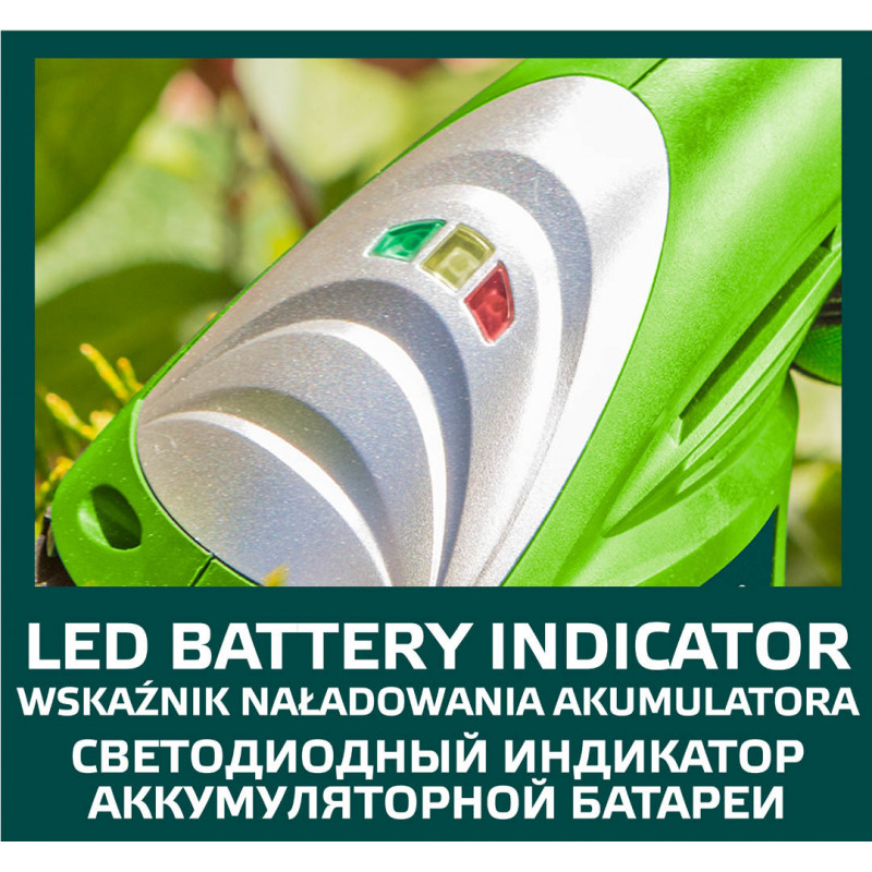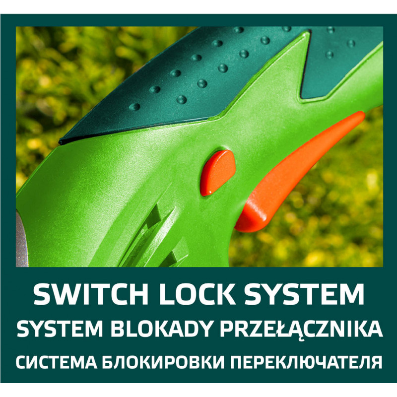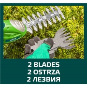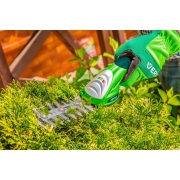 Trymer do trawy i żywopłotu 7.2V, Li-Ion/1.3Ah, szer. cięcia 80/120 mm (nożyce do trawy/nożyce do krzewów), maksymalna grubość cięcia z użyciem nożyc do żywopłotu 8 mm, masa z uchwytem do trawy 0.55 kg, masa z uchwytem do krzewów 0.61 kg