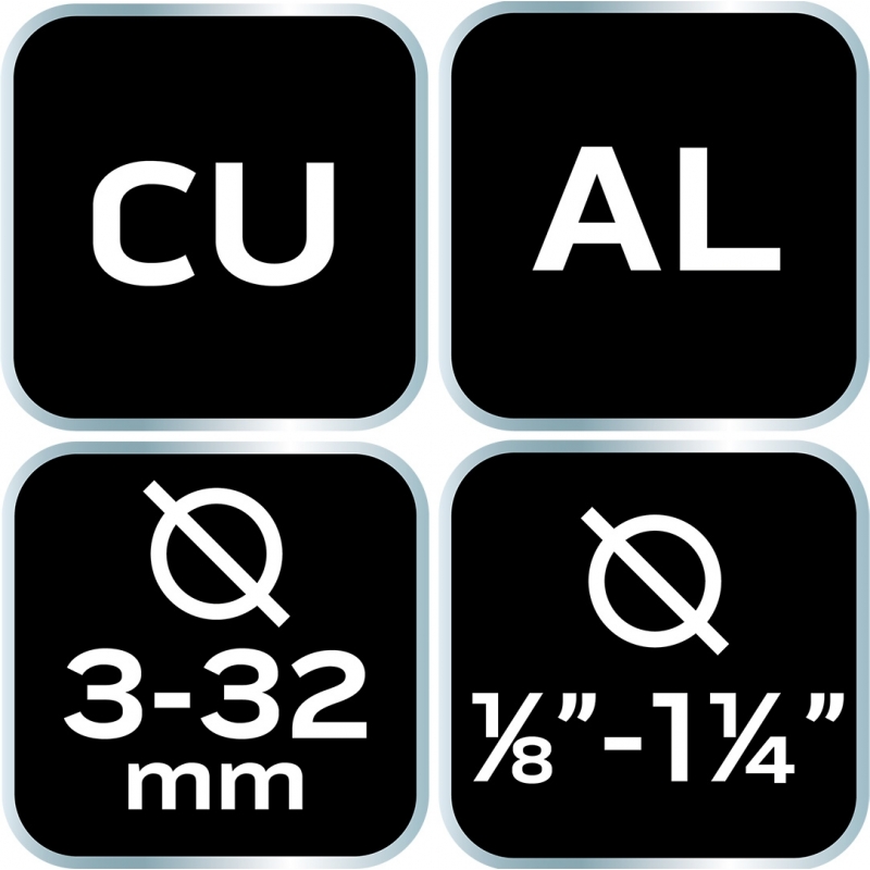 Obcinak do rur miedzianych i aluminiowych 3 - 32 mm (1, 8" - 1.1/4"), teleskopowy, korpus aluminiowy, dwie rolki prowadzące, śruba nastawna, gratownik w korpusie, kółko pasujące 02-407