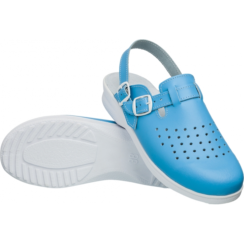 - wierzch perforowany ze skóry naturalnej białej z paskiem do regulacji tęgości, odporny na codzienne mycie i dezynfekcję