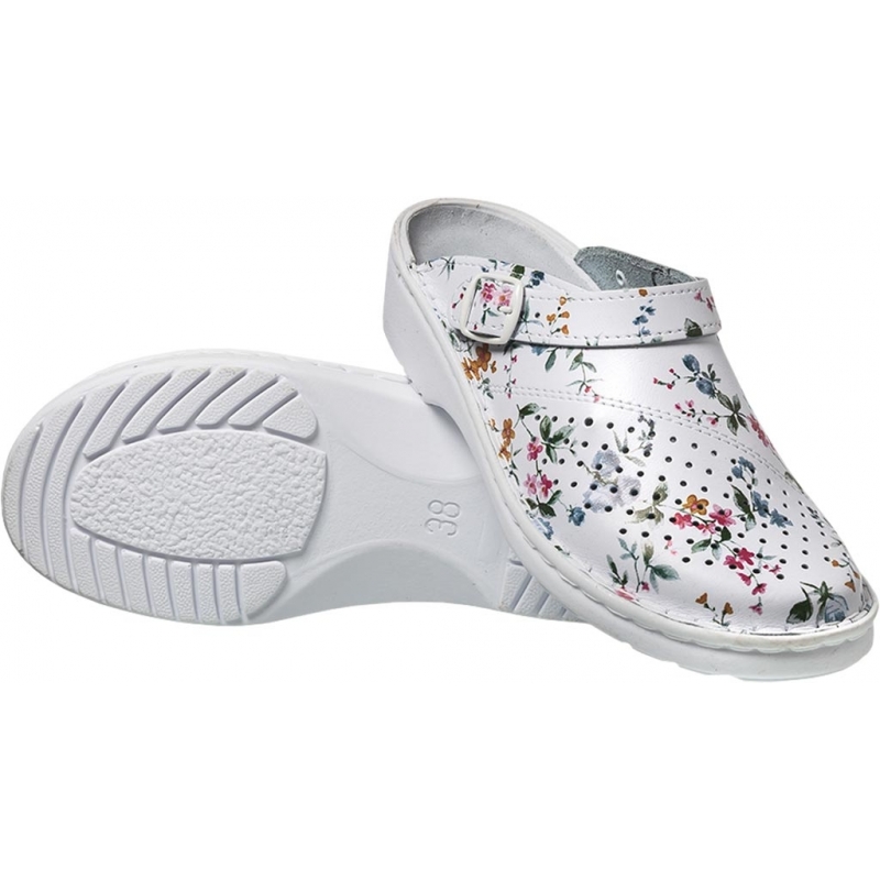 RAW-POL BMKLADZSP to zawodowe klapki medyczne z perforowaną cholewką skórzaną i odkrytą piętą. Obuwie wyposażone jest w pasek dwufunkcyjny przekładany na piętę oraz regulację tęgości. Spód wykonany z ekspandowanego poliuretanu o anatomicznym profilu ortopedycznym, zapewnia komfort i bezpieczeństwo dzięki właściwościom antypoślizgowym. Spełniają wymagania normy EN ISO 20347.