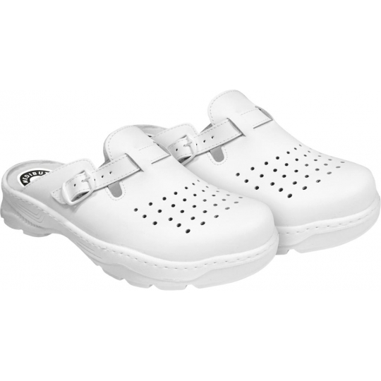 Klapki męskie. - wierzch z naturalnej miękkiej skóry perforowany z paskiem do regulacji tęgości podbicia - wymienna wkładka, ze skóry naturalnej, anatomiczna, antystatyczna impregnowana środkiem bakteriobójczym, z pełnym profilem ortopedycznym ułatwiająca utrzymanie w czystości z możliwością dokupienia zapasowej - podeszwa wykonana z lekkiego i elastycznego PU o właściwościach antypoślizgowych i antystatycznych z głębokim bieżnikiem antypoślizgowym - montaż klejony i dodatkowe szycie wzmacniające na obwodzie - spełniają wymagania normy EN20347