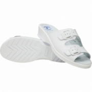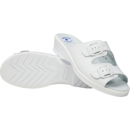 Klapki damskie na koturnie. - cholewka wykonana ze skóry pokrytej powłoką ułatwiającą mycie i dezynfekcję - możliwość regulacji tęgości dzięki dwóm paskom z klamrami - wyściółka skórzana ze skóry naturalnej welurowej, impregnowanej środkiem bakterio i grzybobójczym podklejona pianką latex z dodatkiem węgla aktywowanego - spód PU z profilem ortopedycznym - protektor antypoślizgowy - podeszwa odporna na oleje, tłuszcze roślinne i zwierzęce - spełniają wymagania normy EN20347