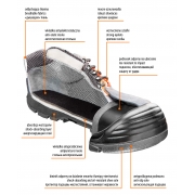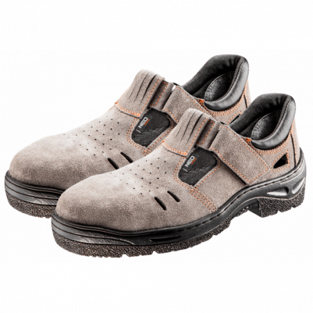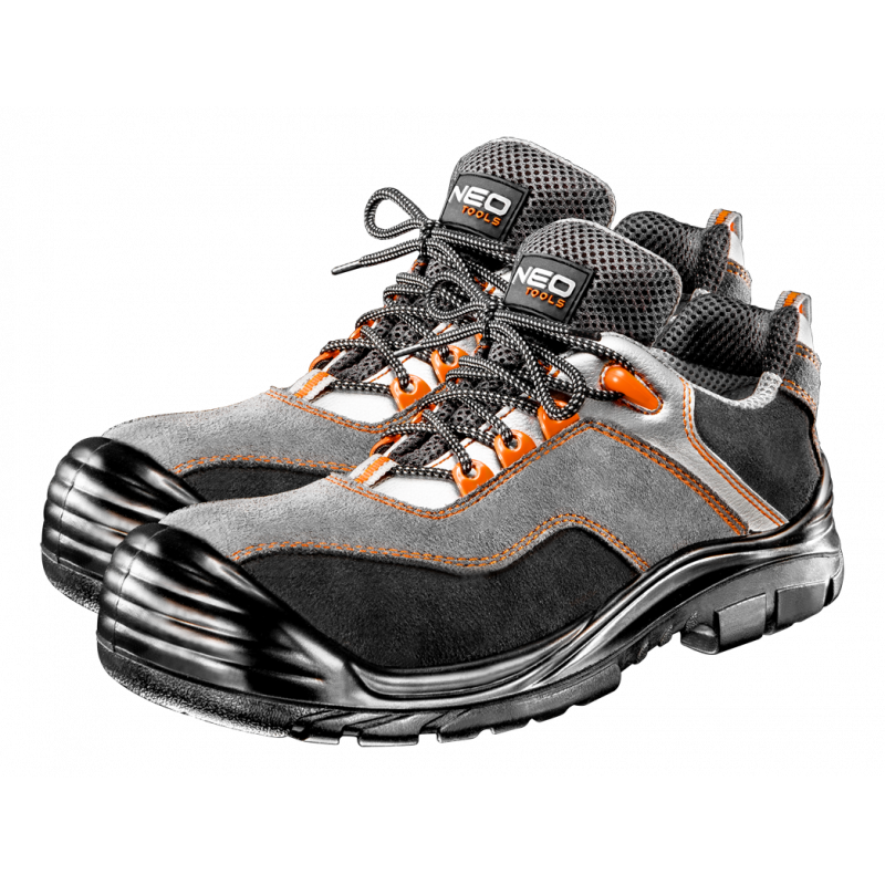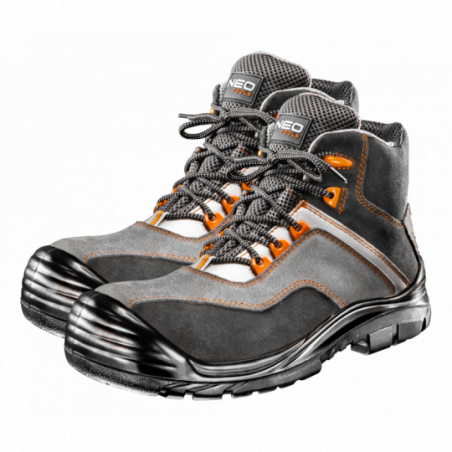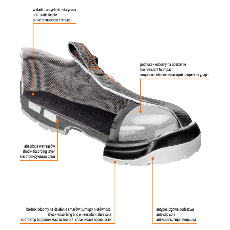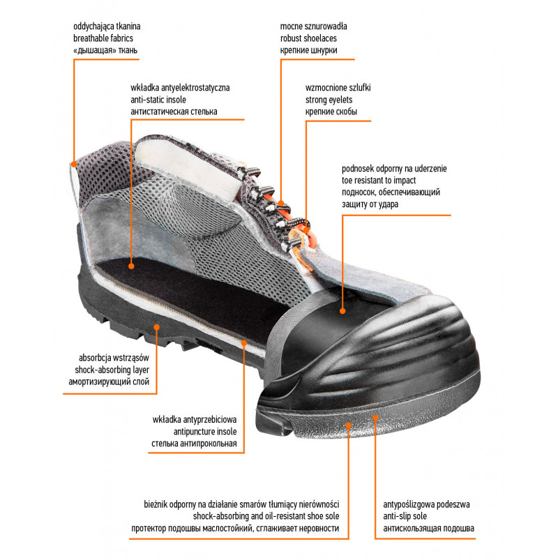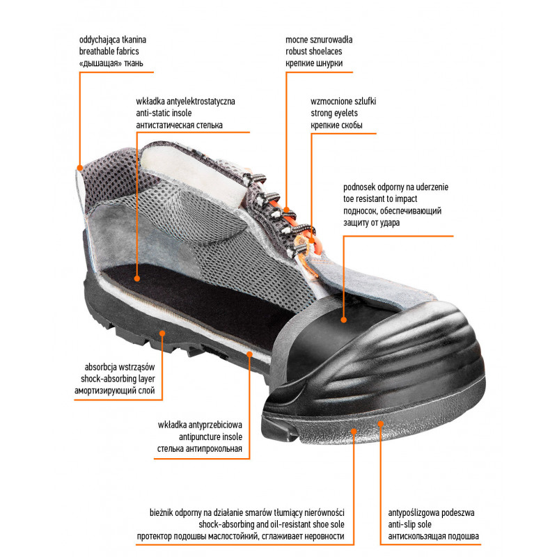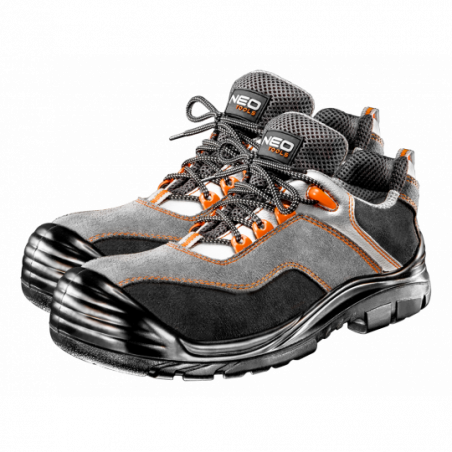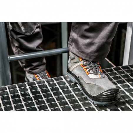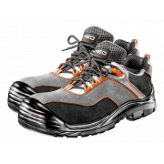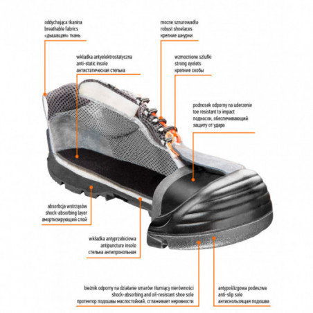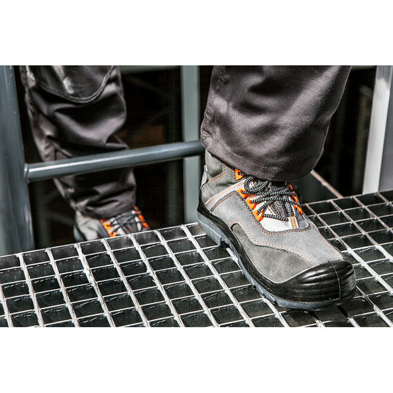 Półbuty robocze, zamszowe, wodoodporne, bez elementów metalowych, antypoślizgowa podeszwa z systemem absorbującym wstrząsy, odporna na ścieranie, oleje, benzynę i inne rozpuszczalniki organiczne, podnosek kompozytowy wytrzymujący uderzenie do 200J, kompozytowa wkładka antyprzebiciowa, wkładka antyelektrostatyczna, but wykonany w kategorii S3 SRC (SRC- odporność na poślizg na podłożu ceramicznym pokrytym roztworem laurylosiarczanu sodu (SLS) i na podłożu ze stali pokrytym glicerolem), certyfikat CE