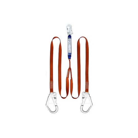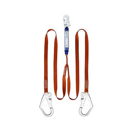 Amortyzator bezpieczeństwa z podwójną taśmą poliamidową. Całkowita długość urządzenia 2 m + 2 m. Fabrycznie dołączone zatrzaśniki stalowe AZ 002 i AZ 022 Amortyzator wykonany z taśmy poliamidowej. Wymiary amortyzatora: 160 x 35 x 45 mm. Maksymalne wydłużenie amortyzatora: ~1 m. Urządzenie posiada certyfikat CE. Amortyzatory bezpieczeństwa są składnikiem osobistego sprzętu chroniącego przed upadkiem z wysokości zgodnym z normą PN-EN 355.
