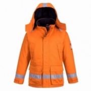 - Ta ocieplana kurtka trudnopalna i antystatyczna jest idealna dla potrzeb przemysłu petrochemicznego i gazownictwa. Została wykonana z takiego samego materiału zewnętrznego jak kombinezon FR50. Dodatkowo posiada warstwę izolacyjną i bawełnianą podszewkę trudnopalną. Na kurtce naszyto taśmy ostrzegawcze. Dwukierunkowy zamek główny z mosiądzu oraz dwie kieszenie na klatce piersiowej z zamkami z mosiądzu oferują dodatkowe korzyści. Kurtka posiada wewnętrzną regulację na wysokości pasa. Dodatkowym atutem jest kaptur dopinany na zamek mosiężny.