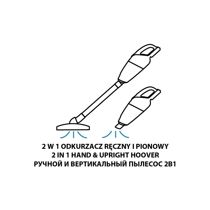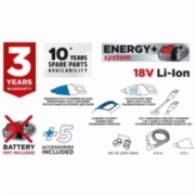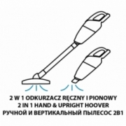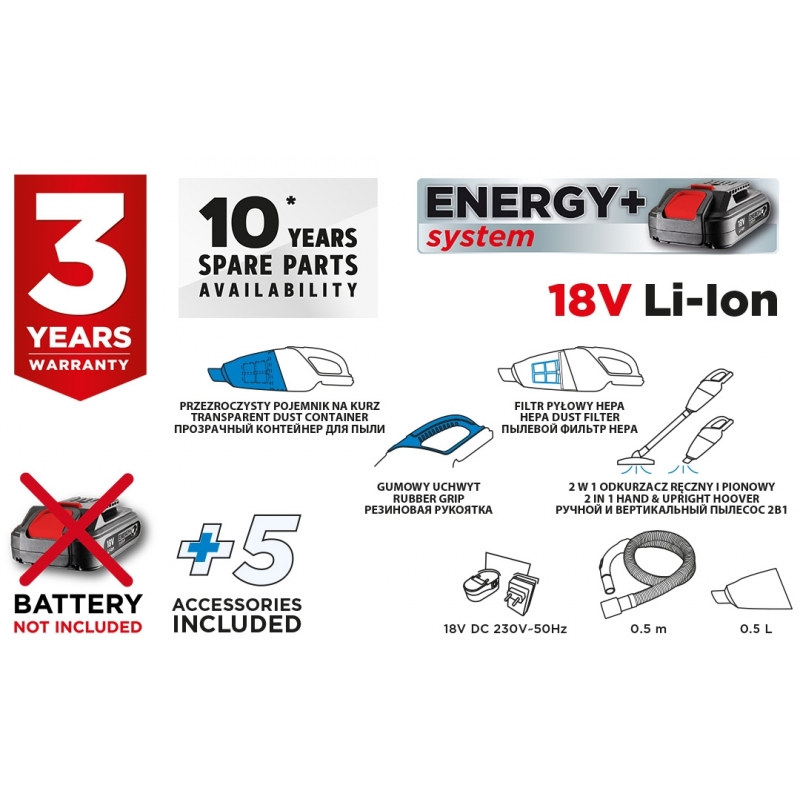 Odkurzacz akumulatorowy 2 w 1 - ręczny i pionowy Energy+ 18V, pojemność pojemnika na kurz 0,5L, akcesoria: filtr pyłowy HEPA, rura do pracy w pionie, ssawka podłogowa, ssawka szczelinowa, wąż elastyczny 0,5 m, bez akumulatora