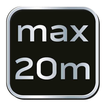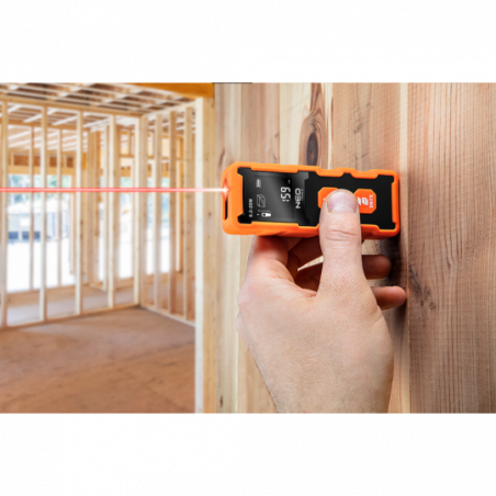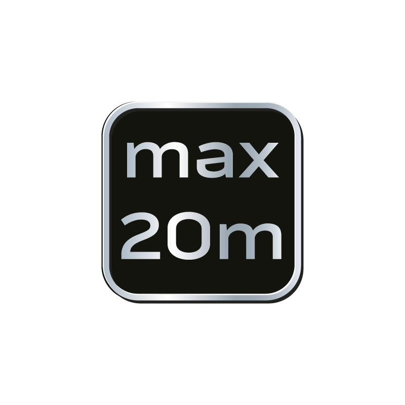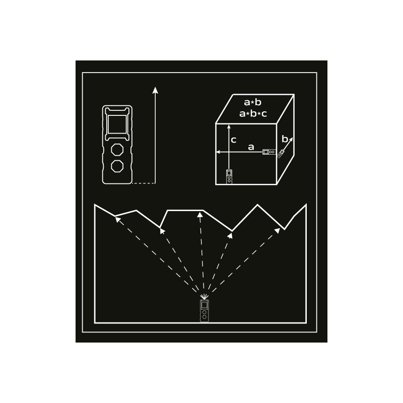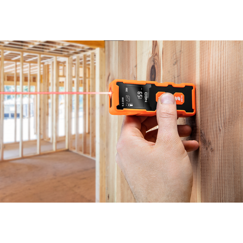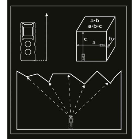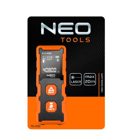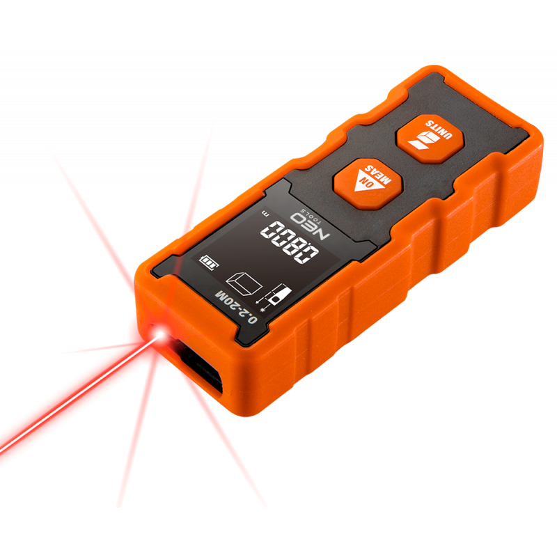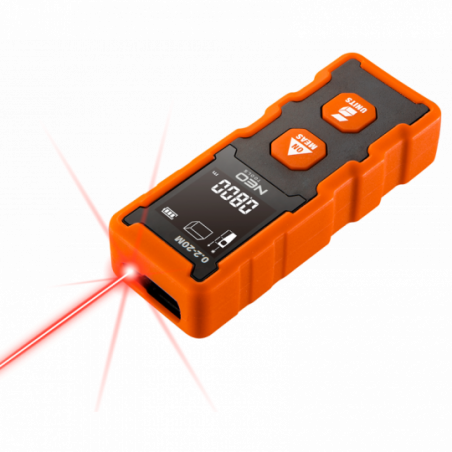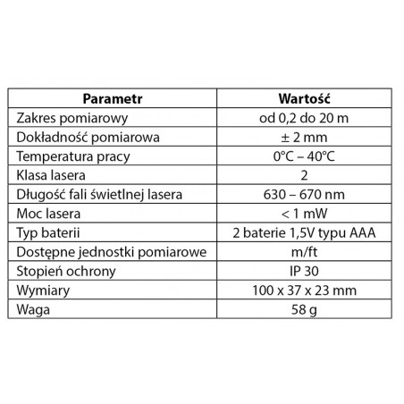 Dalmierz laserowy, zakres pracy 0.2 - 20 m, dokładność +/- 2 mm, zmiana jednostki pomiaru w m/ft/inch; funkcje: pomiar odległości, pola powierzchni, objętości; trwała obudowa z ABS i gumy; baterie 2 * AAA 1.5V; automatyczne wyłączanie; podświetlenie ekranu; certyfikat CE