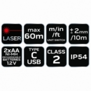 Dalmierz laserowy, IP54, zasięg 0,05 – 60 m, długość wiązki lasera 635 nm, zasilanie 2xAA NI-MH akumulatory, lub 2 baterie alkaliczne typu AA, pamięć 30 ostatnich pomiarów, II klasa, jednostki miary: m/in/ft, pomiar odległości, pola powierzchni, objętości, pomiar ciągły, Pitagoras, dodawanie i odejmowanie, pomiar maksymalny i minimalny, możliwość pomiaru od początku, środka i końca urządzenia, elektroniczny kątomierz, regulowana głośność, w zestawie kabel do ładowania USB typu C, opaska na nadgarstek