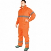 Komplet przeciwdeszczowy w skład którego wchodzą spodnie do pasa i kurtka. - wykonany z poliester/PCV - komplet zapakowany w saszetkę, którą można wykorzystać do transportowania innych przedmiotów - odblaskowy pasek na klatce piersiowej i plecach oraz nogawkach zwiększają widoczność - klejone szwy stanowią dodatkowe zabezpieczenie przed dostaniem się wody - kurtka: zapinana na suwak; kaptur ściągany na troczki schowany w kołnierzu; dwie kieszenie w dolnej część kurtki z zakładkami zabezpieczającymi przed dostaniem się do nich wody; możliwość zwężenia rękawów za pomocą nap oraz ściągany na troczki dół kurtki zapewniają lepszą ochronę przed wiatrem; system wentylacji pod pachami zapewnia niezbędną cyrkulację powietrza - spodnie: wykończone w pasie rozciągliwą gumką; dwie boczne kieszenie; możliwość zwężenia dołu nogawek za pomocą nap, co zapewnia lepszą ochronę przed wiatrem - doskonale sprawdza się w złych warunkach pogodowych