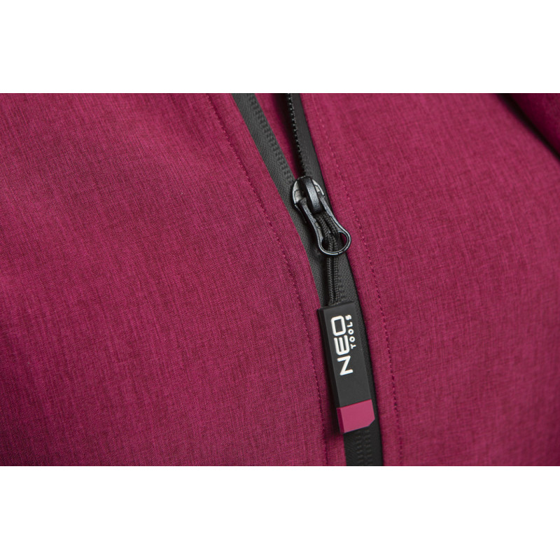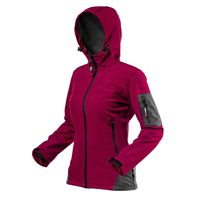 Kurtka softshell damska, rozmiar S, wykonana z wysokiej jakości tkaniny softshell, z kapturem, wodoodporność 8000 mm, oddychalność 1000 g/m2/24h, wiatrochronna, wodoodporne suwaki, polarowa strona wewnętrzna, ściągacz w dolnym szwie, 3 kieszenie zapinane na suwak, wszywka identyfikacyjna, modna kolorystyka, certyfikat CE