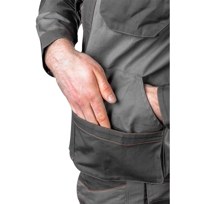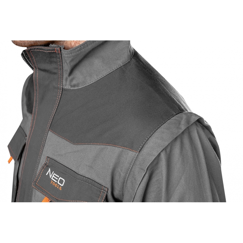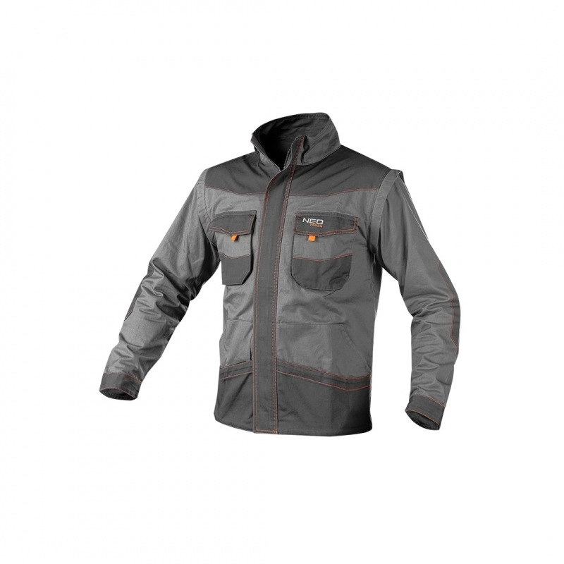 Bluza robocza 2 w 1, 100% cotton, gramatura 260 g/m2, wykonanie z bawełnianej tkaniny typu twill zapewnia dużą trwałość i odporność na rozerwanie, odpinane rękawy w szybki i łatwy sposób zmieniają bluzę w kamizelkę, podwójna warstwa tkaniny na ramionach i łokciach, wielofunkcyjne i pojemne kieszenie, plisa zakrywająca suwak, profilowane łokcie, wewnętrzna wszywka imienna, Certyfikat CE, rozmiar S