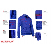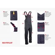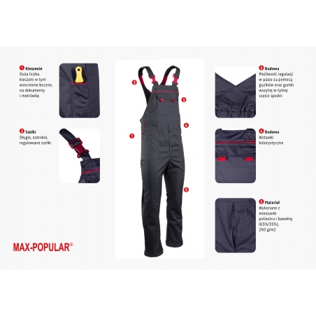 UBRANIE ROBOCZE MAX‑POPULAR – spodnie ogrodniczki i bluza roboczaUbranie robocze MAX‑POPULAR to trwały i funkcjonalny zestaw przeznaczony do intensywnej pracy w wymagających warunkach. Wysokiej jakości tkanina zapewnia stabilność kolorów i rozmiarów nawet po wielokrotnym praniu, a solidne szycie gwarantuje długą żywotność. Zestaw składa się ze spodni ogrodniczek oraz bluzy roboczej, które dzięki przemyślanej konstrukcji, licznym wzmocnieniom i praktycznym kieszeniom zapewniają wygodę, bezpieczeństwo i swobodę ruchów podczas pracy. Spodnie ogrodniczki MAX‑POPULAR