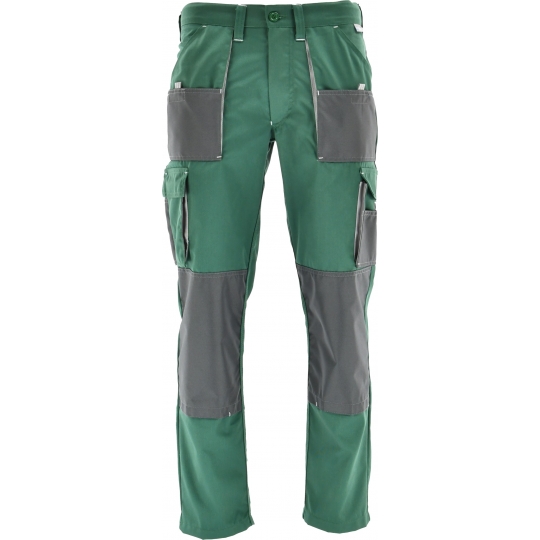 Model wyposażony jest w wzmocnione kieszenie na kolanach z materiału typu kordura, potrójne szwy w kroku i na wewnętrznych nogawkach, a także praktyczny zestaw kieszeni: dwie naszywane dolne, dwie boczne, dwie tylne z patkami oraz kieszeń miarowa. Elastyczny pas z tyłu zwiększa wygodę noszenia.