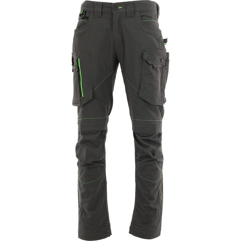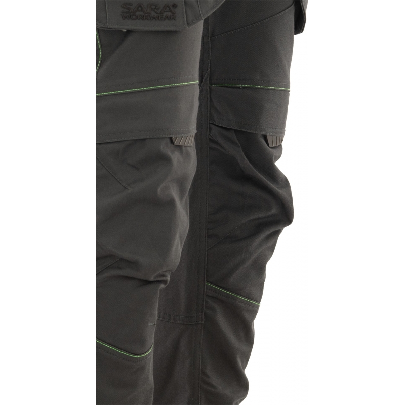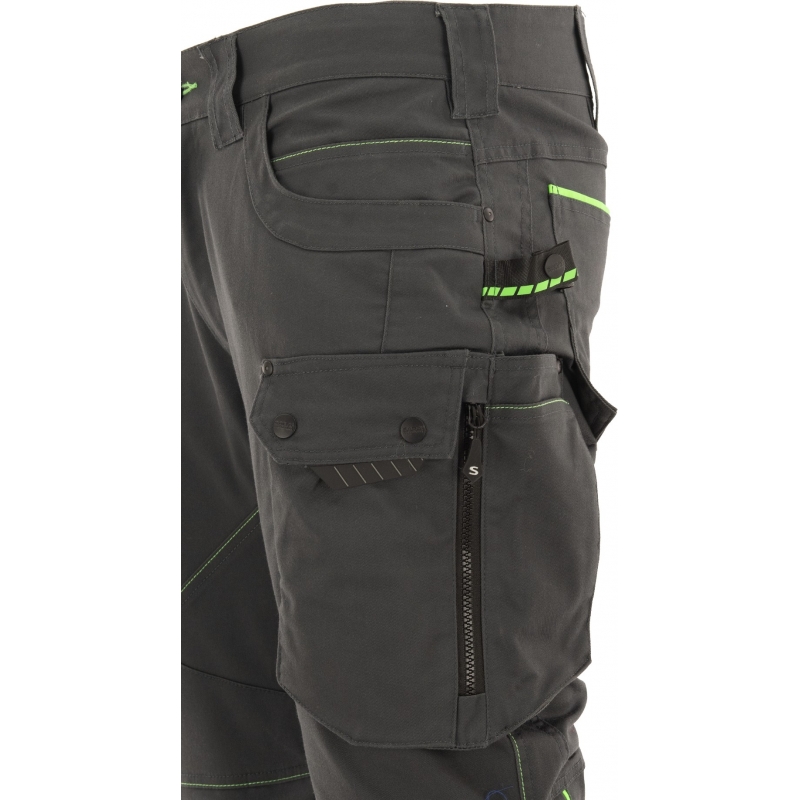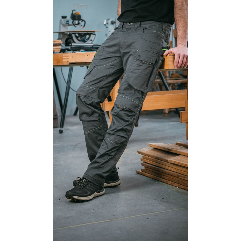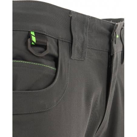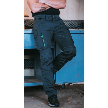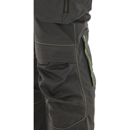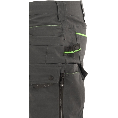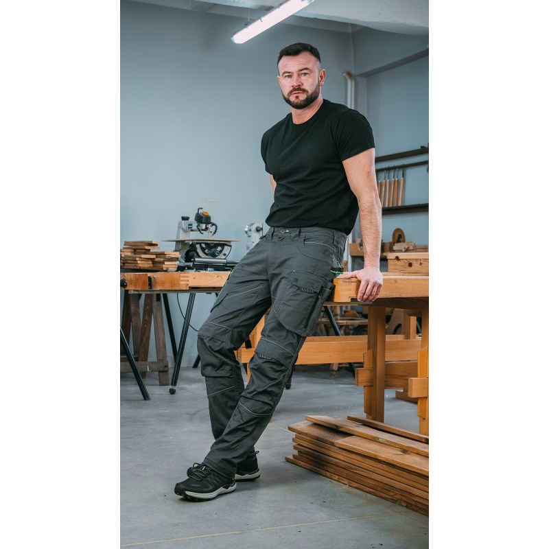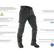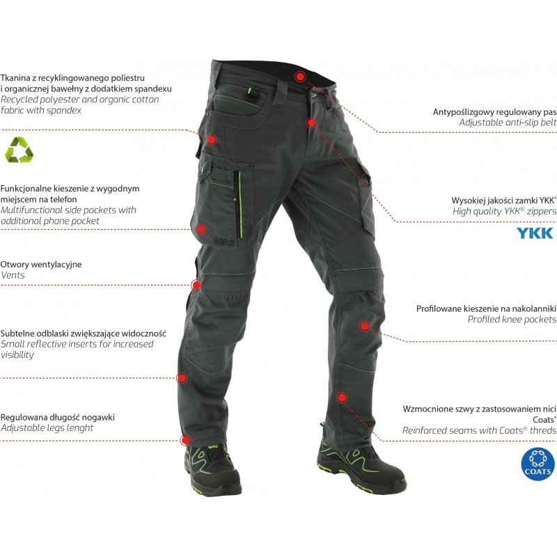 -bawełniana tkanina o dużej wytrzymałości » wykorzystany poliester pochodzi z recyklingu i zachowuje wszystkie właściwości użytkowe » ergonomiczny i funkcjonalny krój » dwie kieszenie wsuwane » funkcjonalne kieszenie udowe, dołem luźne » dwie kieszenie tylne » kieszenie na nakolanniki z zapięciem na rzep od góry » otwory wentylacyjne zapinane na zamek błyskawiczny z tyłu, na obu nogawkach » nogawki z możliwością regulacji długości » pas tyłu wykończony gumą przeciwpoślizgową » subtelne odblaski » zawieszka na klucze