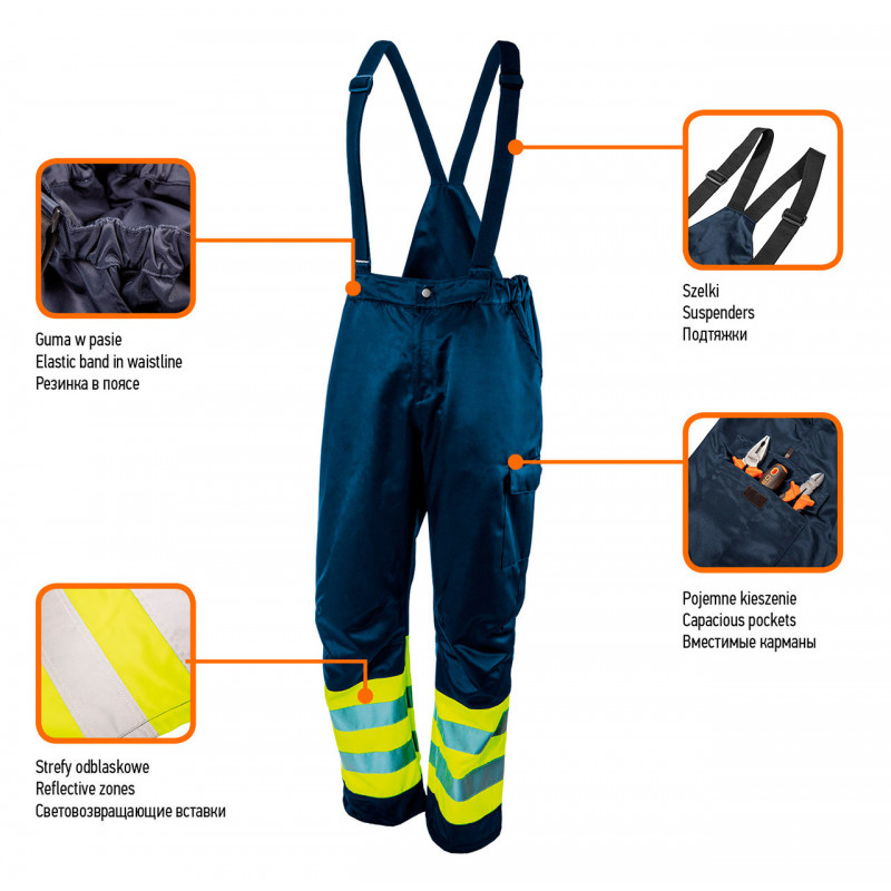 Ogrodniczki robocze, ostrzegawcze, granatowe, rozmiar XL