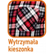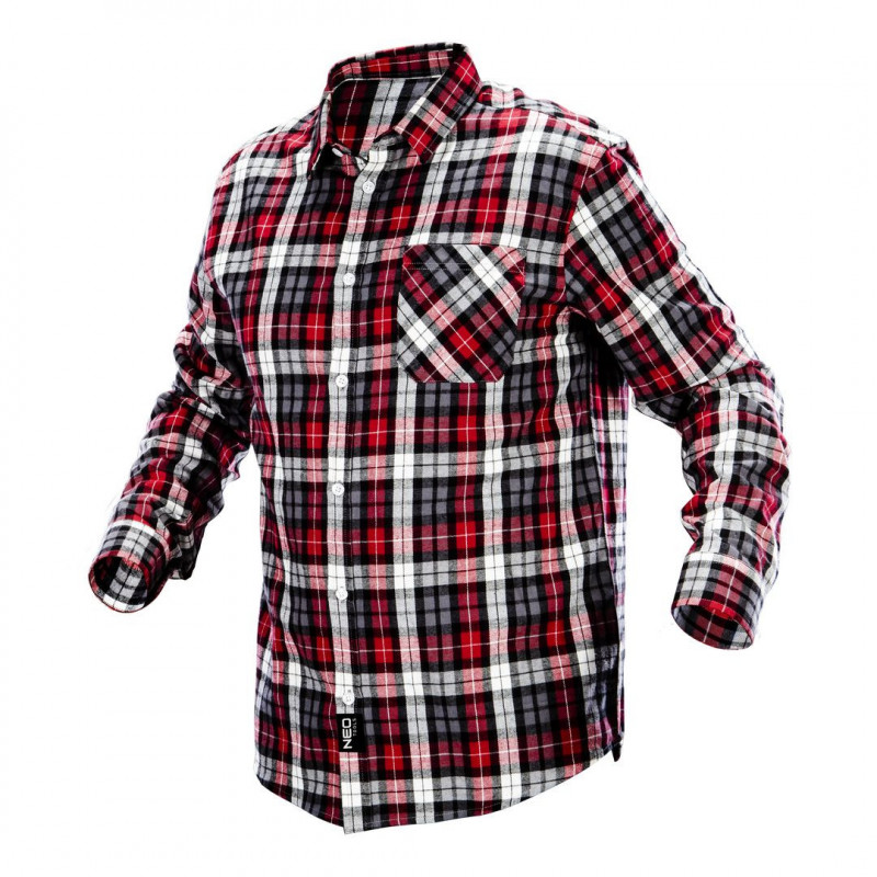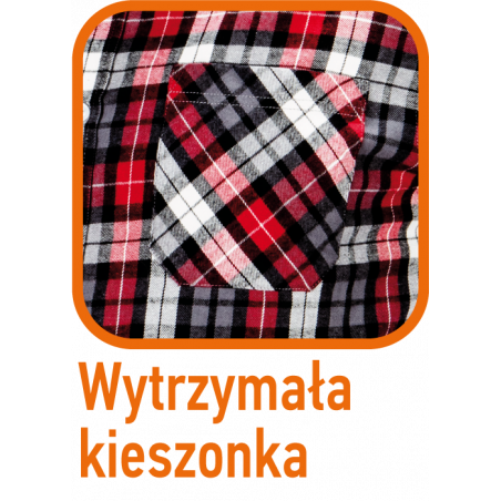 Koszula flanelowa, czerwono- szaro- biała krata tkana z uprzednio barwionej przędzy, 100% bawełna, 180 g/m2 rozmiar S, certyfikat CE