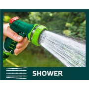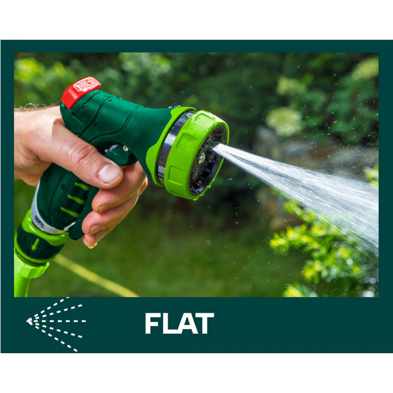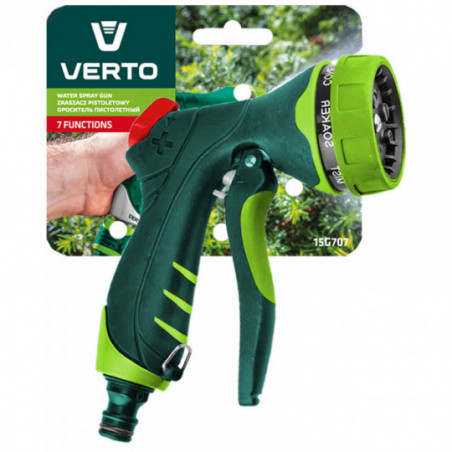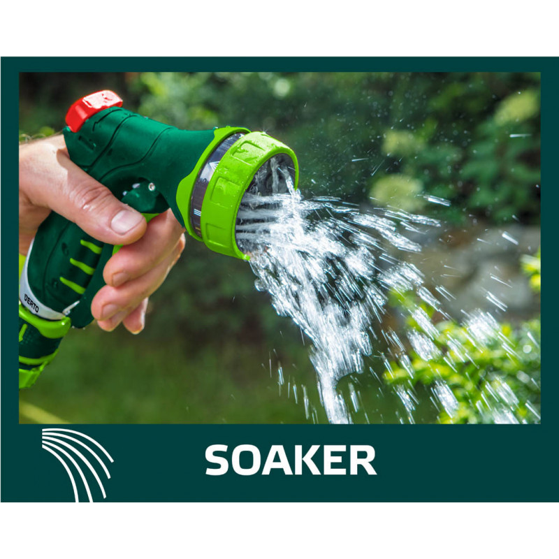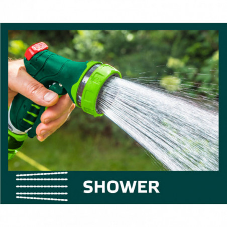 Zraszacz pistoletowy 7-funkcyjny, możliwość wyboru strumienia o różnej sile i funkcji, czytelne oznakowanie rodzaju strumienia, przednia dźwignia z blokadą, dwumateriałowy uchwyt
