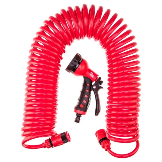 Zestaw z wężem spiralnym 10 m., zraszacz pistoletowy wielofunkcyjny, przyłącze do kranu, złączki