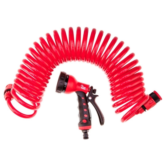 Zestaw z wężem spiralnym 15 m., zraszacz pistoletowy wielofunkcyjny, przyłącze do kranu, złączki