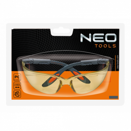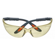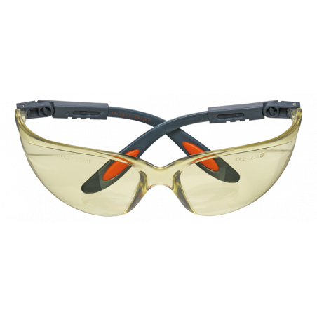 Okulary ochronne poliwęglanowe, żółte soczewki, nylonowe ramiona, regulacja długości i kąta zauszników, gumowe zakończenie, odporne na zarysowania, CE