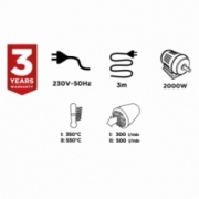 Opalarka 2000W, zakres temperatur: I: 350ºC, II: 550ºC, przepływ powietrza II: 300 l/min, II: 500 l/min, (LxH) 336x 80 mm, masa 0.6 kg