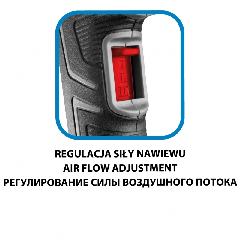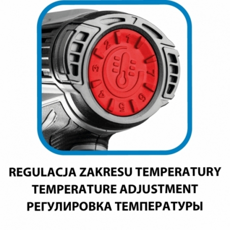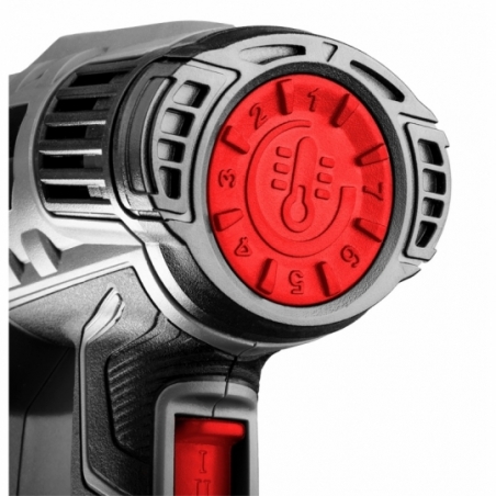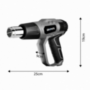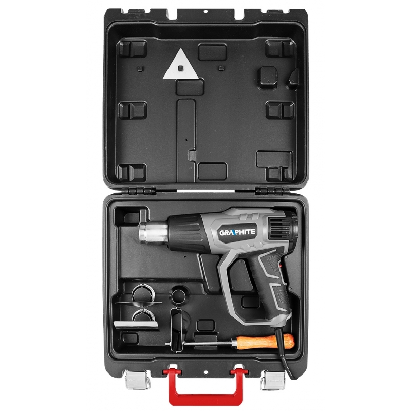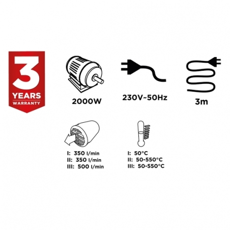 Opalarka 2000W, zakres temperatur:I: 50ºC, II: 50-550ºC, III: 50-550ºC, przepływ powietrza I: 350 l/min, II: 350 l/min, III: 500 l/min, (LxH) 250 x 200 mm, masa 0.7 kg, akcesoria: 4 dysze, skrobak z rączką, walizka