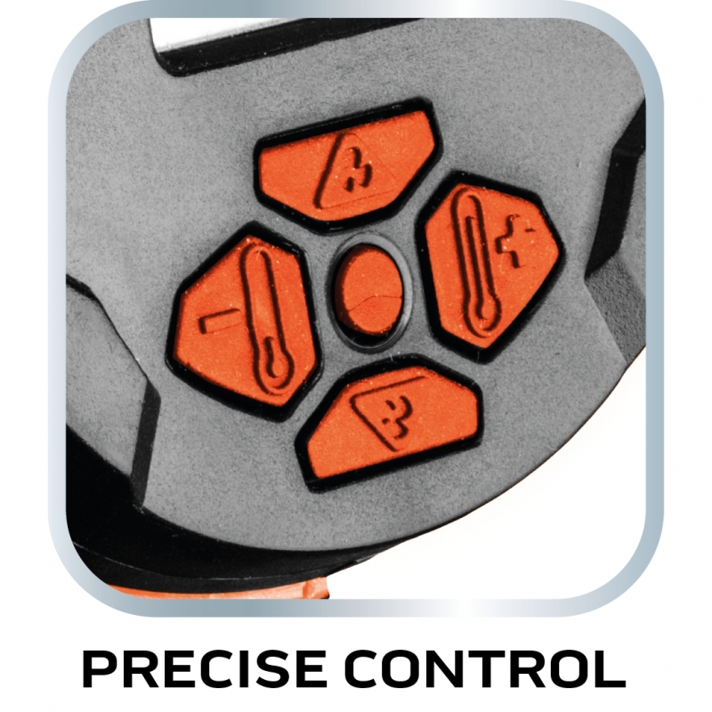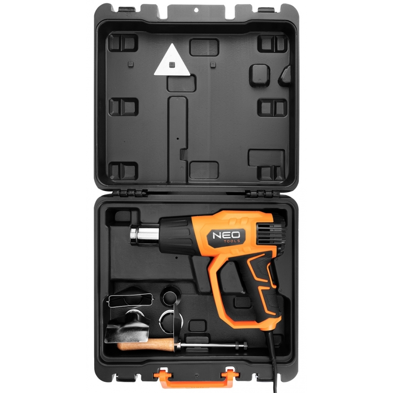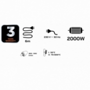 Opalarka 2000W, zakres temperatur: I: 50ºC, II: 70-600ºC, przepływ powietrza 300 - 500 l/min, (LxH) 250 x 190 mm, masa 0.77 kg, akcesoria: 4 dysze, skrobak z rączką, walizka
