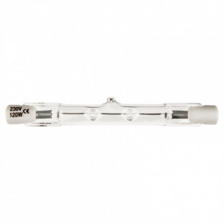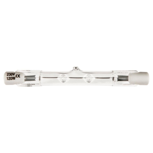 Żarówka halogenowa R7S, 120 W, 230V, 50Hz; jasność 2220 lumenów, średnia długość świecenia 2000 h, temperatura barwowa 3000K, długość 78 mm, CE