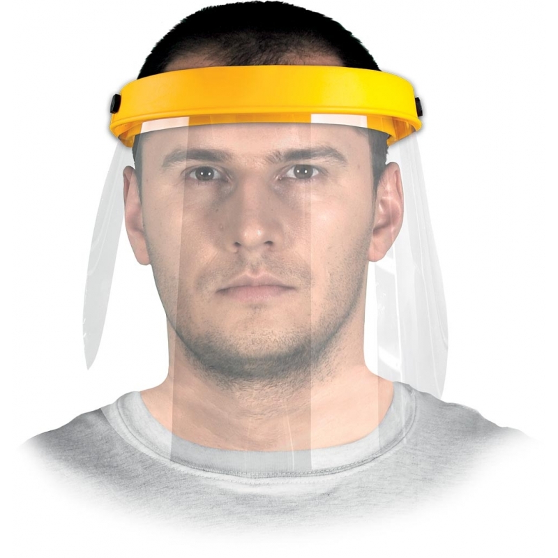 Osłona twarzy składająca się z szybki przeciwodpryskowej, ramki oraz taśmy opasującej głowę.
