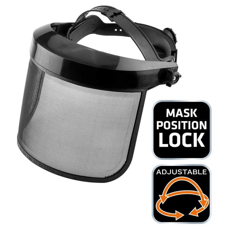 Osłona przeciwodpryskowa twarzy, siatkowa, wysokość siatki: 200 mm, szerokość siatki: 350 mm, grubość siatki: 0,8 mm, masa osłony: 313 g, nagłowię wykonane z poliwęglanu o grubości 1.5 mm, regulację obwodu głowy, głębokości osadzenia, regulacji odległości siatki ochronnej względem twarzy w płaszczyźnie poziomej, chroni przed odpryskami ciał stałych o średniej energii uderzenia (prędkość do 120 m/s), odporność na zapalenie, certyfikat CE